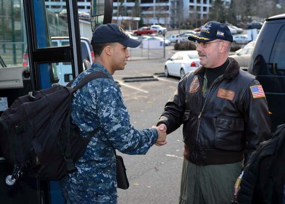 Aircraft carrier USS Nimitz (CVN 68) welcomed home 54 of its Sailors who returned to Naval Base Kitsap-Bremerton (NBK), Dec. 19, after helping USS George Washington (CVN 73) shift homeports from Yokosuka, Japan, to Norfolk, Virginia.