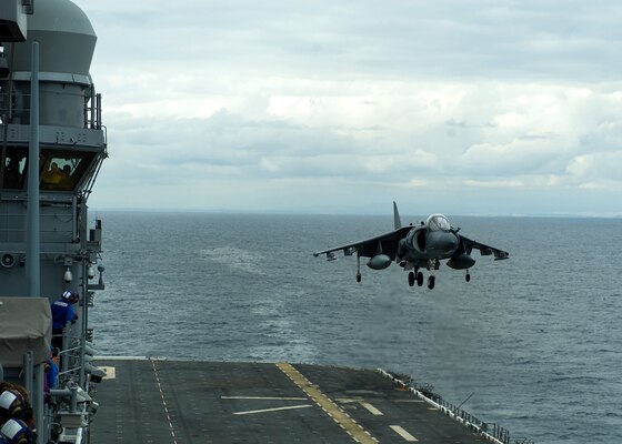 The flight deck was quiet - unusual for what typically goes on there. Then, without much warning, there it was. An AV-8B Harrier was hovering in the near distance waiting to make its mark into the history books of the Navy's newest amphibious assault ship. Harriers arrived aboard USS America (LHA 6) for the first time this week while underway off the coast of San Diego. The arrival of the Harriers marks a significant step for America in becoming fully certified in air operations. The overall mission of the Harriers is to provide offensive air support to the Marines. Marines are able to provide this support due to their ability to attack and destroy surface and air targets, escort helicopters and conduct other air operations as directed. Afloat Training Group (ATG) was present for the first day of Harrier operations and provided feedback for the air crew on board. "They observed the crew in action, made some minor suggestions, and recommended to SURFPAC [Surface Forces Pacific Fleet] that America be certified for fixed wing operations, and SURFPAC gave the thumbs up the following morning," said Cmdr. Brian Fitzpatrick, air boss of America. "Combine that with our previous tilt-rotor and rotary wing certification, we are fully certified." With the arrival of Harriers, there was increased pressure in the week leading to the certification. The leaders of air department recognized it and made sure their junior Sailors were prepared and comfortable for the evolution. "I told them nothing has changed," said Aviation Boatswain's Mate 1st Class Lawrence Salalila, V-3 division leading petty officer. "Just relax, you've done this before through your qualifications earned in Yuma (Arizona) and on the USS Pelielu, just apply what you've learned onto the flight deck and nothing can go wrong." The air department aboard America received vital training from the Marine Attack Squadron (VMA) 311 "Tomcats" at the Marine Corps Air Station in Yuma, Arizona. The airfield is painted in the design of a ship to prepare service members with an exact representation of what they will see in their own work environments. The training is designed to provide various situations for the handlers on the flight deck. Aviation Boatswain's Mate (Handling) 3rd Class Andrew Roseberry said he was elated to have the opportunity to handle Harriers and apply what he had learned through his training. "I was very confident with my skills in how to operate and direct them," said Roseberry. "It was a good feeling to finally get a fixed wing aircraft on our flight deck. It was a lot of fun, and I'm looking forward to continuing to do it." By becoming fully certified in all air operations, America was able to let marine expeditionary units certify their aircraft for upcoming deployments. Capt. Robert A. Hall Jr., commanding officer of USS America, highlighted the accomplishments of the America crew on the last day of Harrier operations and made a ship-wide announcement. "I could not be more proud of what this crew has done over these past few days," said Hall. "Senior Navy and Marine Corps leadership have both already reached out to me and expressed their gratitude. It is definitely recognized, at the highest level, that our Sailors have gone over and above to really support the Blue-Green team, which is really what our mission is. Your work and dedication to your country helps the Marines who are preparing for deployments and various missions right around the corner." A professional work environment is a standard for any work place, and America is no exception. Maintaining professionalism on the flight deck is extremely vital for the safety of the personnel operating in this high-risk environment. Capt. Brayden Cummins, a pilot assigned to VMA-311, spoke about the pride and professionalism that Sailors aboard America showed throughout the week. "They're very professional Sailors on board," said Cummins. "They know what they are doing, and they've been trained very well." With America being fully certified in all air operations combined with their training and experience, they will be ready for any and all challenges that lie ahead.