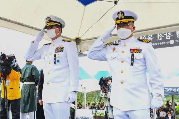 Rear Adm. Michael “Buzz” Donnelly, commander, U.S. Naval Forces Korea, and Vice Adm. Lee Jong Ho, commander, Republic of Korea (ROK) Fleet, marked the anniversary at a victory ceremony commemorating the Battle of Korea Strait on COMROKFLT naval base in Busan, June 26. Donnelly previously joined ROK Navy leadership at a memorial commemoration at the United Nations Cemetery and later at a memorial concert at the naval base, June 25.