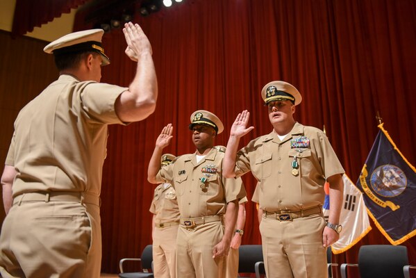 Service members and civilians from across Korea gathered in Busan to support both Senior Chief Petty Officer Andre Amos and Chief Petty Officer Christopher Sherman as they transitioned to chief warrant officer.