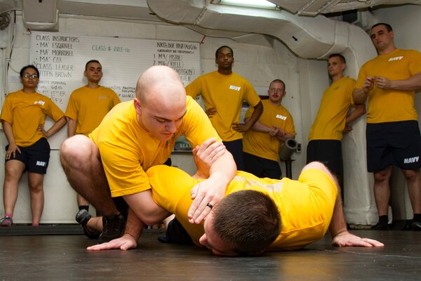 The 88 security force personnel are charged with the responsibilities of keeping good order and discipline and ensuring more than 5,000 Sailors currently aboard Ike are protected from a variety of possible threats. All security personnel have to go through weeks of training to understand and learn the proper levels of force to use in a given situation. They are taught the necessary restraints, learning to use the least amount of force possible to control a situation.