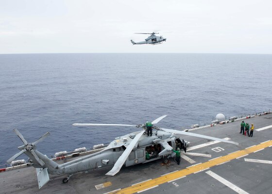 USS Boxer, flagship of the Boxer Amphibious Ready Group, along with amphibious transport dock ship USS New Orleans (LPD 18), amphibious dock landing ship USS Harpers Ferry (LSD 49), and the embarked 13th Marine Expeditionary Unit, is operating in the Western Pacific in support of security in the Indo-Asia-Pacific region.