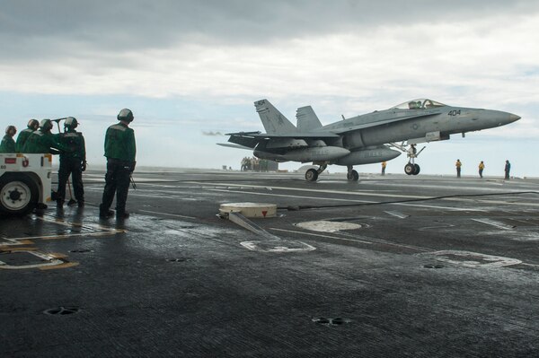 Lt. Christopher Montague, test pilot and project officer for Carrier Suitability Squadron (VX) 23, landed an F/A-18E, which marked the beginning of flight operations and the continuing preparations for GHWB's upcoming deployment.