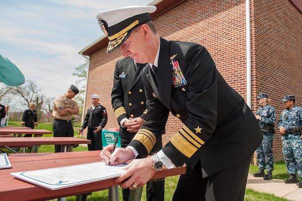Vice Adm. Walter "Ted" Carter, superintendent of the U.S. Naval Academy, was joined by Capt. Logan Jones, commanding officer of NSA Annapolis; Capt. Michael McGinnis, commanding officer of Naval Health Clinic Annapolis; and Cmdr. John Downes, commanding officer of the Navy Operational Support Center in Baltimore, to sign this year's Sexual Assault Awareness and Prevention Month proclamation.