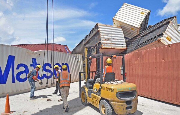 "The Saipan stevedores [local crane operators] are doing crane operations to lift the containers that piled up during the typhoon. They then use forklifts and move the containers for inspection where they look at them for damage or hazmat," said McLelland. "If they have hazmat cargo in them we will come in and do a full cargo inspection on it and make sure that all the packaging is intact, that nothing is leaking and document all the containers. They'll then be set aside for future use, for insurance purposes or to be scrapped."