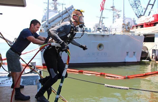 "The job went really well," said USS Anzio Chief Engineer Lt. Cdr. Justin Neff. "The divers have been awesome in communicating with us. They had a couple of hiccups here and there, which is to be expected on such a major job, but they really worked hard to finish ahead of schedule and keep us mission ready."