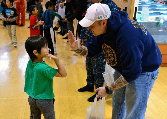 The Sailors and their family members dressed up in Halloween costumes and gave candy to more than 100 elementary schoolchildren while visiting two after-school care centers sponsored by the city of Misawa.