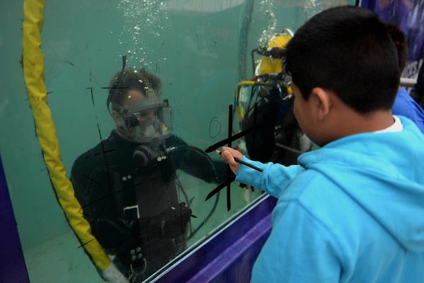 While in the tank, divers played the age old game of tic-tac-toe with students in attendance. The divers also talked to visitors about their experiences in the Navy, explained the usage of the different equipment that was on display and provided information about their jobs.