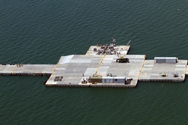 Along with the temporary pier construction, a floating platform called the roll-on-roll-off discharge facility was assembled offshore and towed four miles to moor to USNS 2nd Lt. John P. Bobo (T-AK 3008). The platform is in position to stage cargo from the Bobo for transfer to the Trident Pier by other sea craft.