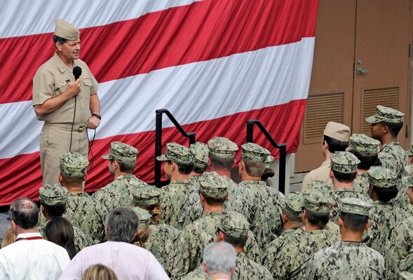 Chief of Naval Personnel (CNP) Vice Adm. Bill Moran met with Naval Special Warfare (NSW) Sailors during an all-hands call on Naval Amphibious Base Coronado, July 14.