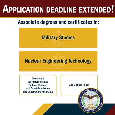 This gives more opportunity for active duty enlisted Sailors, Marines, and Coast Guardsmen and Coast Guard Reservists to apply to one of these two degree programs. “We want to ensure the maximum opportunity for application into these programs while still having the time to review applicants for eligibility into the program, receiving command approval, and enrolling into the partner institution,” said USNCC’s director of enrollment Alphonso Garrett. “Through ongoing discussions with our partner institutions, we have developed a process to shorten that timeline to enrollment, which means there is more opportunity for Sailors, Marines, and Coast Guardsmen to apply for one of these two programs.” Those that applied to either degree program by the original deadline of Mar. 27, 2022, will have their applications reviewed and a decision made by Apr. 17. Those that apply between Mar. 27 and Apr. 17 will have their applications reviewed and a decision made in May. “We anticipate that some applicants may not be able to commit to enrolling in June due to operational tempo and life commitments,” said Garrett. “We still want to provide the opportunity to service members that may be ready to start their journey of lifelong learning.” This means that the decision-making process would be a rolling process until all of the available seats are filled with eligible and approved candidates. “The last thing we want is to have an opportunity for a deserving service member seeking a naval relevant education to go unfulfilled,” said Sgt. Maj. Mike Hensley, USNCC’s command senior enlisted leader. “These educational opportunities support the warfighting capability and operational readiness our naval forces need to maintain a competitive edge over our potential adversaries.” Active duty enlisted Sailors, Marines, and Coast Guardsmen and Coast Guard Reservists can fill out an application for the Military Studies and Nuclear Engineering Technology associate degree programs on the USNCC website, www.usncc.edu. The first courses will start in June 2022. The United States Naval Community College is the official community college for the Navy, Marine Corps, and Coast Guard. To get more information about the USNCC, go to www.usncc.edu. Click on the student interest form link to learn how to be a part of the USNCC Pilot II program.