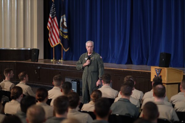 Meier met with Rear Adm. Pete Garvin, commander, Naval Education and Training Command (NETC) and received a brief on enlisted aviation training. The visit included tours of the Center for Naval Aviation Technical Training (CNATT), Naval Air Technical Training Center (NATTC) and Naval Aviation Schools Command (NASC). At NATTC, Meier visited the Aviation Boatswains Mate, Aviation “A” School and experienced hands on training in aircraft towing, spotting, and firefighting procedures, which are essential for the safe and efficient execution of the air plan. While at NASC, Meier spoke with Naval Introductory Flight Evaluation (NIFE) program students during an all hands call. Speaking with the students, Meier stressed the importance of planning in naval aviation and personal readiness. “Being ready starts at the individual level,” said Meier. “It involves hard work and sacrifice.” He told NIFE students that planning and preparing are tasks they will do their entire career. “The pursuit of perfection is perpetual. You’ll never get there,” said Meier. “What’s amazing about the Blue Angels is not the air shows. It’s their perpetual pursuit of perfection.”