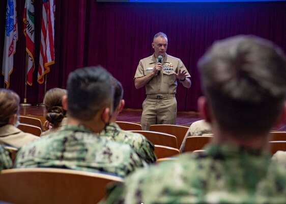 The roadshow highlights the current and projected composition of each operational medicine community with the goal of helping interns make decisions regarding their post-internship career path. Presenters included senior medical corps officers from BUMED, Navy Personnel Command (PERS), and each of the four major operational medicine communities: Surface Fleet, Undersea Medicine, Aviation Medicine and Fleet Marine Force. What do all of the operational medicine communities have in common? At the core, they serve our Naval and Marine Corps warfighters. This is why such selection is not to be taken lightly. “Two years ago in these same chairs sat an intern just like you, and one year later — almost to the day — he was in Kabul,” said Capt. Travis Deaton, 1st Marine Division surgeon. “Do you remember what happened one year ago,” asked Deaton. “The Kabul airport suicide bombing.”