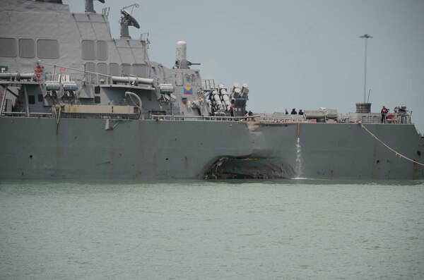 During the collision, John S. McCain sustained significant hull damage that resulted in flooding to nearby compartments, including crew berthing, machinery and communications rooms. Damage control efforts by the crew halted further flooding at sea.