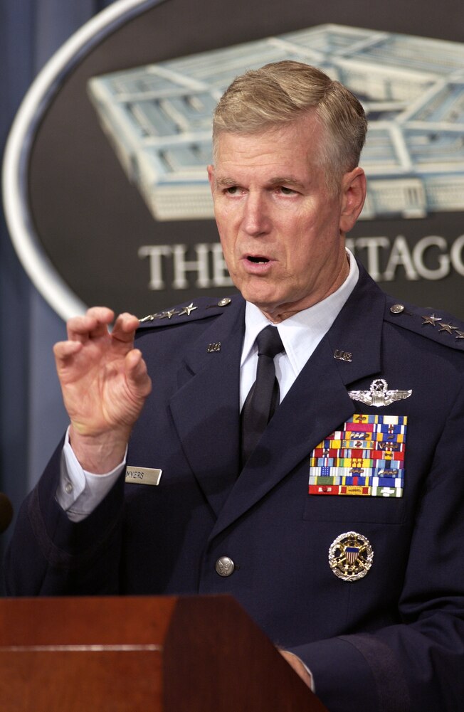 WASHINGTON -- Chairman of the Joint Chiefs of Staff Gen. Richard B. Myers responds to a reporter's question during a Pentagon press briefing on Aug. 5. Myers and Secretary of Defense Donald H. Rumsfeld gave reporters an operational update on Operation Iraqi Freedom. (U.S. Air Force photo Tech. Sgt. Andy Dunaway)