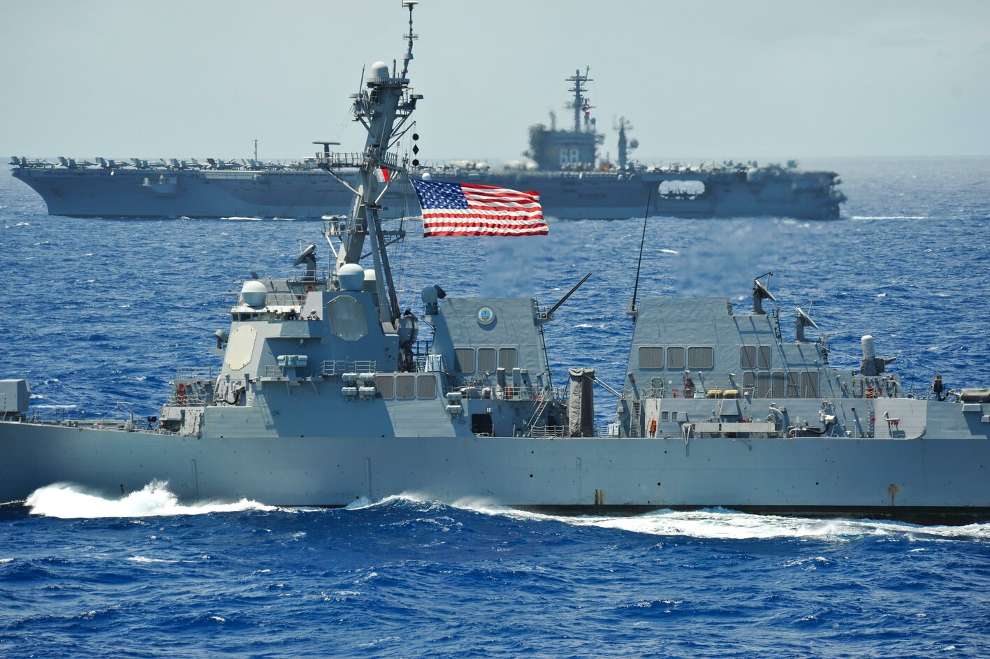 120718-N-RC246-875 PACIFIC OCEAN (July 18, 2012) The guided-missile destroyer USS Chung-Hoon (DDG 93) and the aircraft carrier USS Nimitz (CVN 68) are underway during the Great Green Fleet demonstration portion of the Rim of the Pacific (RIMPAC) 2012 exercise. Nimitz took on 200,000 gallons of biofuel in preparation for the Great Green Fleet demonstration during Rim of the Pacific (RIMPAC) 2012. Twenty-two nations, more than 40 ships and submarines, more than 200 aircraft and 25,000 personnel are participating in RIMPAC exercise from June 29 to Aug. 3, in and around the Hawaiian Islands. The world's largest international maritime exercise, RIMPAC provides a unique training opportunity that helps participants foster and sustain the cooperative relationships that are critical to ensuring the safety of sea lanes and security on the world's oceans. RIMPAC 2012 is the 23rd exercise in the series that began in 1971. (U.S. Navy photo by Mass Communication Specialist 3rd Class Ryan Mayes/Released)