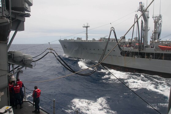 120718-N-SK881-054 PACIFIC OCEAN (July 18, 2012) The guided-missile cruiser USS Princeton (CG 59) pulls alongside the military sealift command fleet replenishment oiler USNS Henry J. Kaiser (T-AO 187) to refuel at sea with biofuel during The Great Green Fleet demonstration portion of the Rim of the Pacific (RIMPAC) 2012 exercise. Princeton took on a 50-50 blend of advanced biofuel and traditional petroleum-based fuel. Twenty-two nations, more than 40 ships and submarines, more than 200 aircraft and 25,000 personnel are participating in the RIMPAC exercise from June 29 to Aug. 3, in and around the Hawaiian Islands. The world�s largest international maritime exercise, RIMPAC provides a unique training opportunity that helps participants foster and sustain the cooperative relationships that are critical to ensuring the safety of sea lanes and security on the world�s oceans. RIMPAC 2012 is the 23rd exercise in the series that began in 1971. (U.S. Navy photo by Mass Communication Specialist 3rd Class Andrew M. Jandik/Released)
