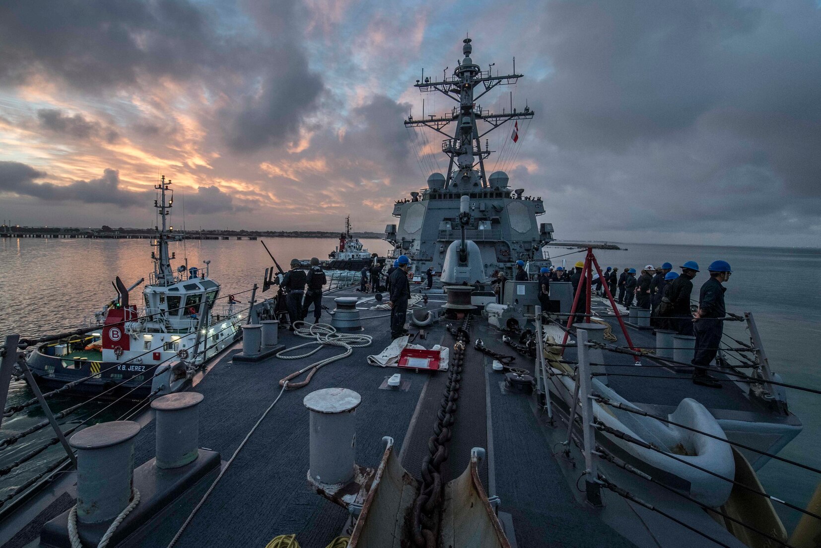 Sailors assigned to the guided missile destroyer USS Carney man the rails while departing from Naval Station Rota, Spain, June 19, 2019.