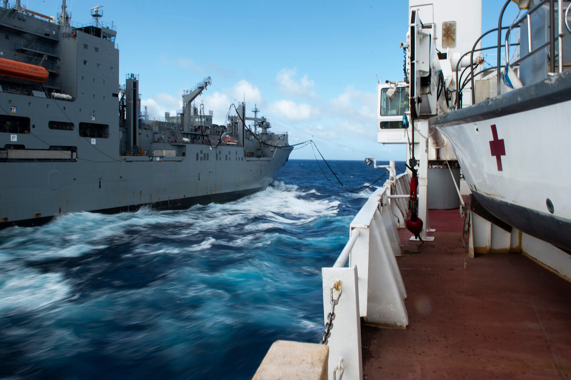 181112-N-DH811-1043 CARIBBEAN SEA (Nov. 12, 2018) The dry cargo and ammunition ship USNS William McLean (T-AKE 12) conducts a replenishment-at-sea with the hospital ship USNS Comfort (T-AH 20) to bring on fuel. Comfort is on an 11-week medical support mission to Central and South America as part of the U.S. Southern Command Enduring Promise initiative. Working with health and government partners in Ecuador, Peru, Colombia and Honduras, the embarked medical team will provide care on board and at land-based medical sites, helping to relieve pressure on national medical systems caused partly by an increase in cross-border migrants. The deployment reflects the United States’ enduring promise of friendship, partnership and solidarity with the Americas. (U.S. Navy photo by Mass Communication Specialist 2nd Class Benjamin T. Liston/Released)