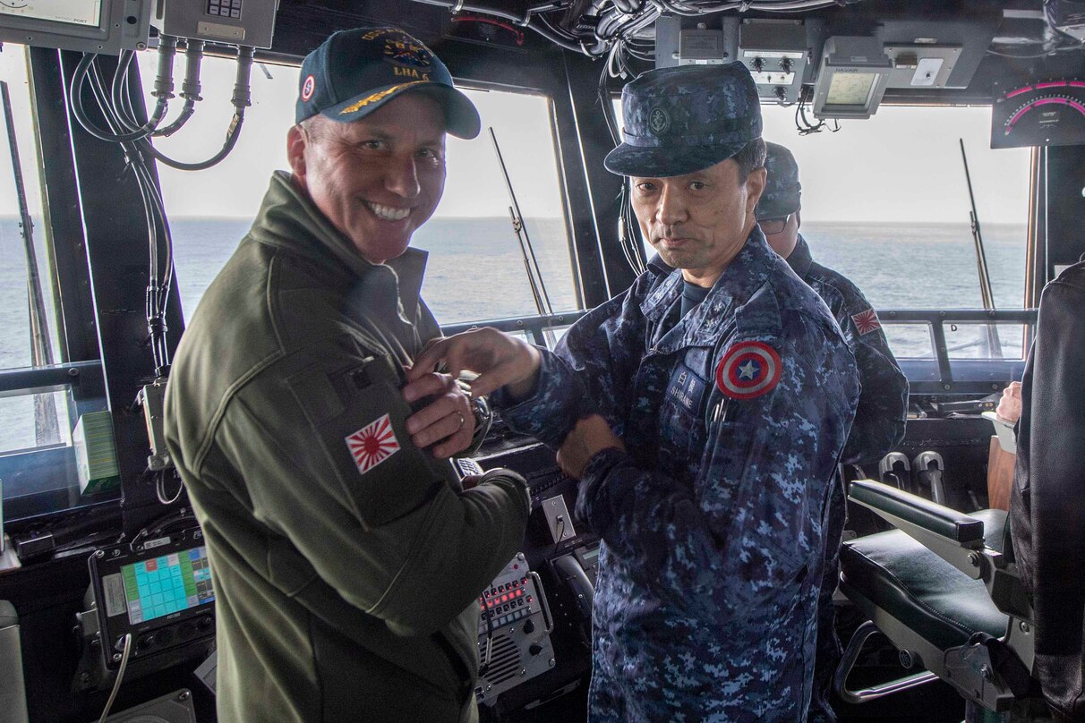 200113-N-ZS023-1022 EAST CHINA SEA (Jan. 13, 2020) Capt. Luke Frost, left, commanding officer of amphibious assault ship USS America (LHA 6) receives a uniform patch from Japan Maritime Self-Defense Force (JMSDF) Rear Adm. Shirane Tsutomu, commander of the JMSDF Mine Warfare Force, during an underway visit. The America Expeditionary Strike Group, 31st Marine Expeditionary Unit team is operating in the U.S. 7th Fleet area of operations to enhance interoperability with allies and partners and serve as a ready response force to defend peace and stability in the Indo-Pacific region. (U.S. Navy photo by Mass Communication Specialist 3rd Class Vance Hand/Released)