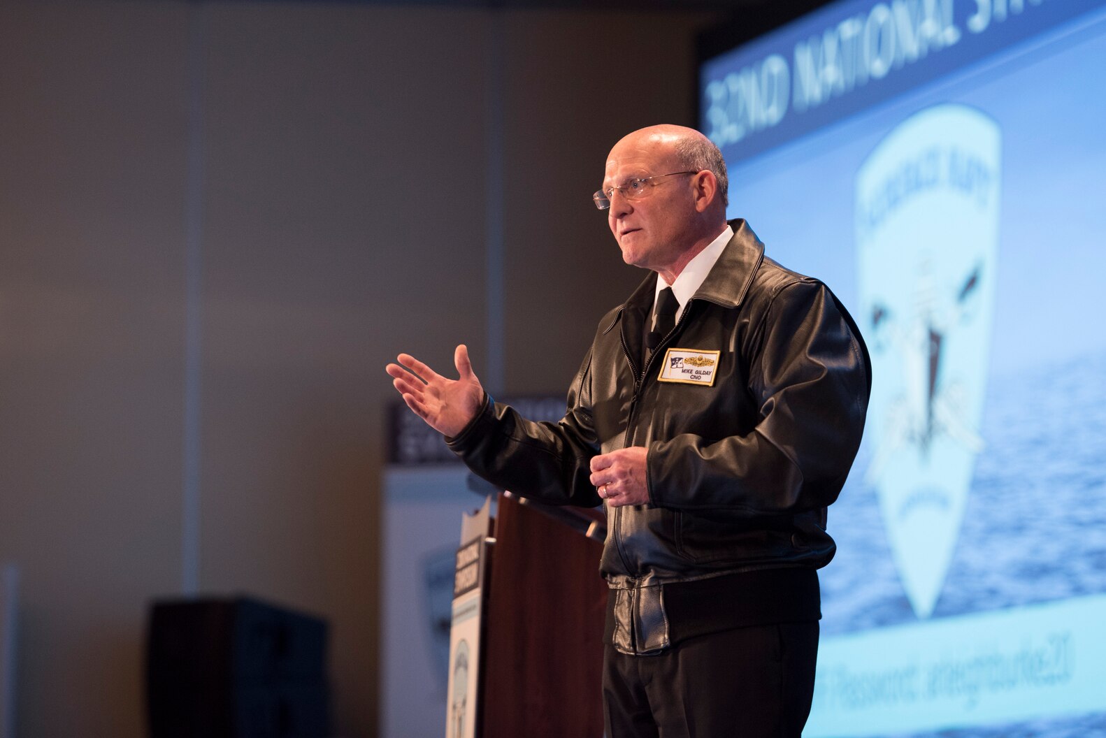 200114-N-BB269-1026 ARLINGTON, Va. (Jan. 14, 2020) Chief of Naval Operations (CNO) Adm. Mike Gilday delivers remarks at the Surface Navy Association's 32nd National Symposium at the Hyatt Regency Crystal City in Arlington, Virginia. The symposium brings together members of the military, business, and academic communities to discuss issues and challenges pertaining to naval surface warfare. (U.S. Navy photo by Mass Communication Specialist 1st Class Raymond D. Diaz III/Released)