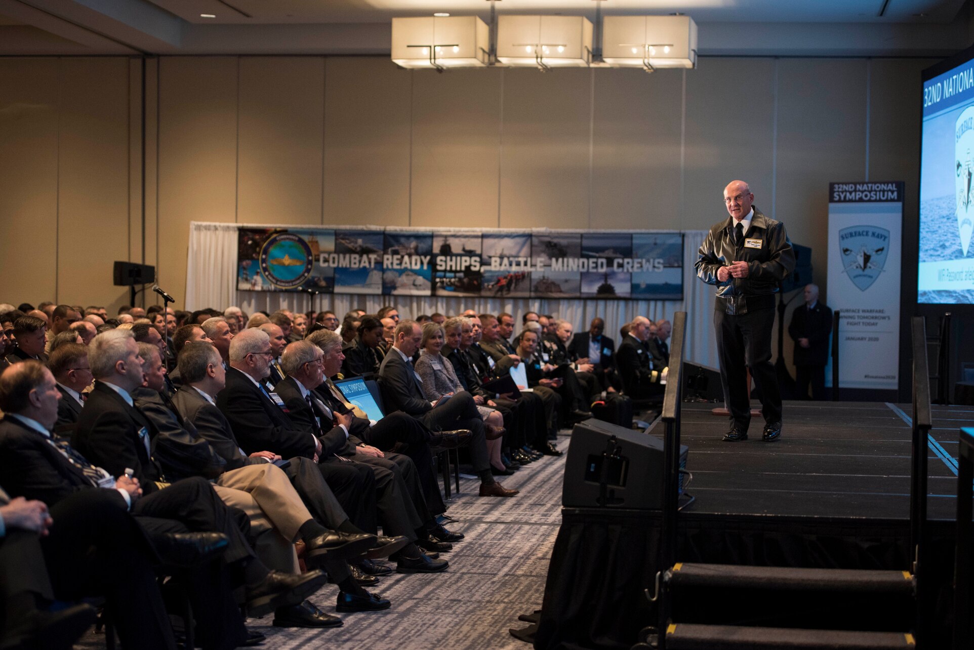 200114-N-BB269-1032 ARLINGTON, Va. (Jan. 14, 2020) Chief of Naval Operations (CNO) Adm. Mike Gilday delivers remarks at the Surface Navy Association's 32nd National Symposium at the Hyatt Regency Crystal City in Arlington, Virginia. The symposium brings together members of the military, business, and academic communities to discuss issues and challenges pertaining to naval surface warfare. (U.S. Navy photo by Mass Communication Specialist 1st Class Raymond D. Diaz III/Released)