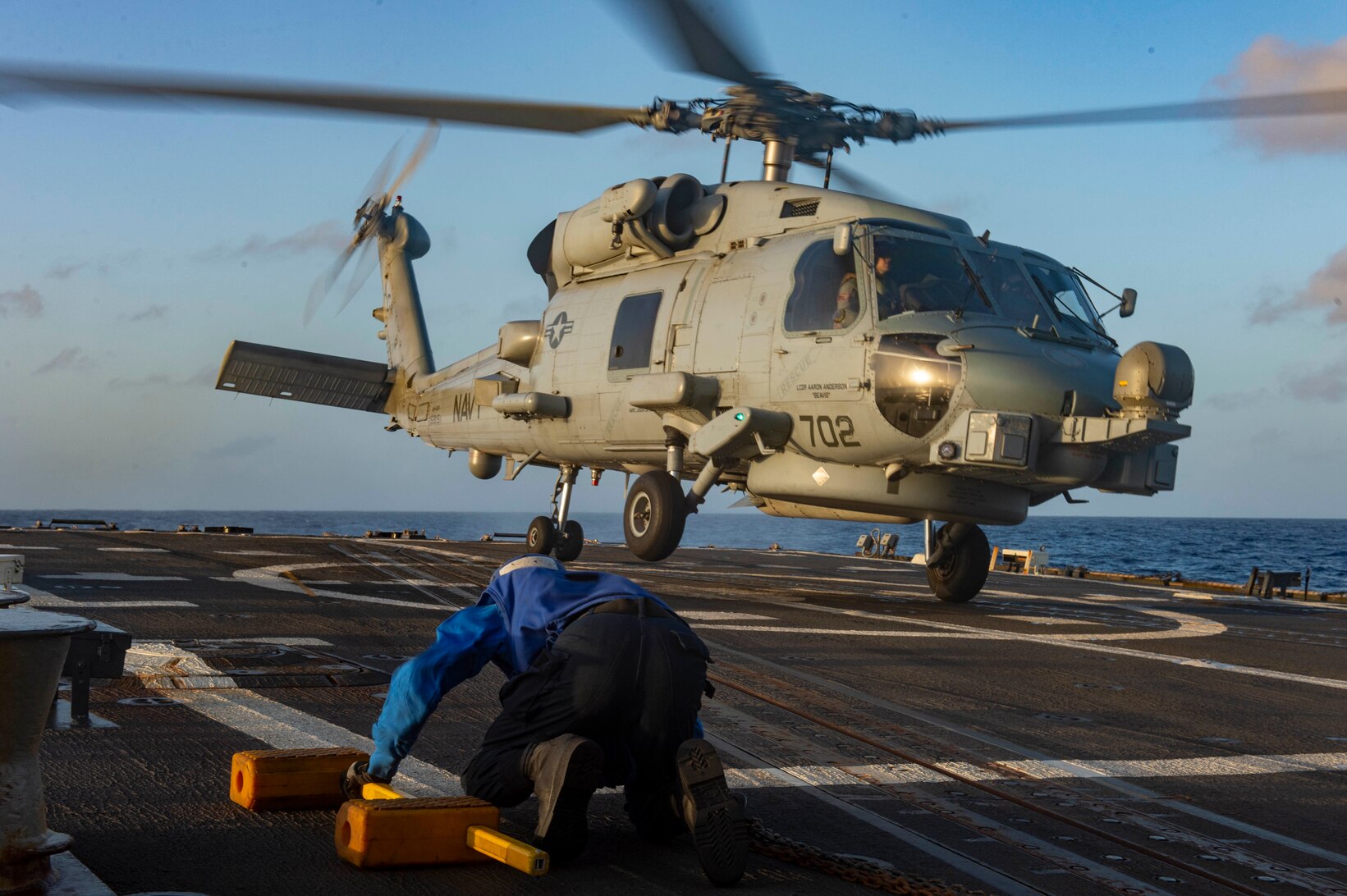 200221-N-HS716-1093 ATLANTIC OCEAN (Feb. 21, 2020) Boatswain's Mate 3rd Class Lucas Shanksfoy, from Huntsville, Alabama, prepares to secure an MH-60R Sea Hawk helicopter with chock and tie-downs aboard the Arleigh Burke-class guided-missile destroyer USS James E. Williams (DDG 95). James E. Williams is conducting operations in the Atlantic Ocean as part of the Dwight D. Eisenhower Carrier Strike Group. (U.S. Navy photo by Mass Communication Specialist 3rd Class Jairus P. Bailey/Released)