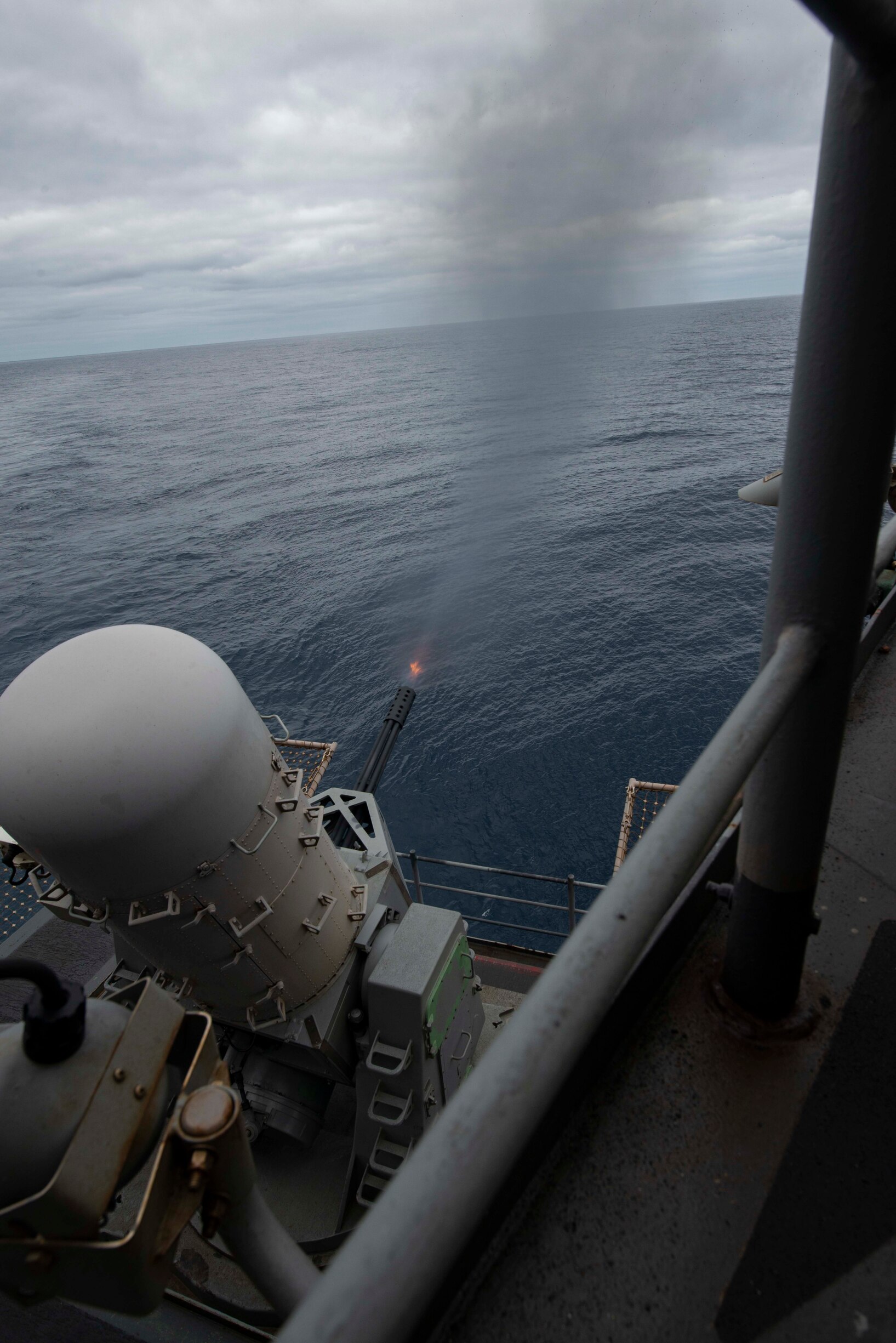 200227-N-DM241-1013 ATLANTIC OCEAN (Feb. 27, 2020) A Phalanx close-in weapon system (CIWS) fires during a live-fire exercise aboard the aircraft carrier USS Dwight D. Eisenhower (CVN 69). Ike is conducting operations in the Atlantic Ocean as part of the Dwight D. Eisenhower Carrier Strike Group. (U.S. Navy photo by Mass Communication Specialist 2nd Class Elizabeth Cohen/Released)