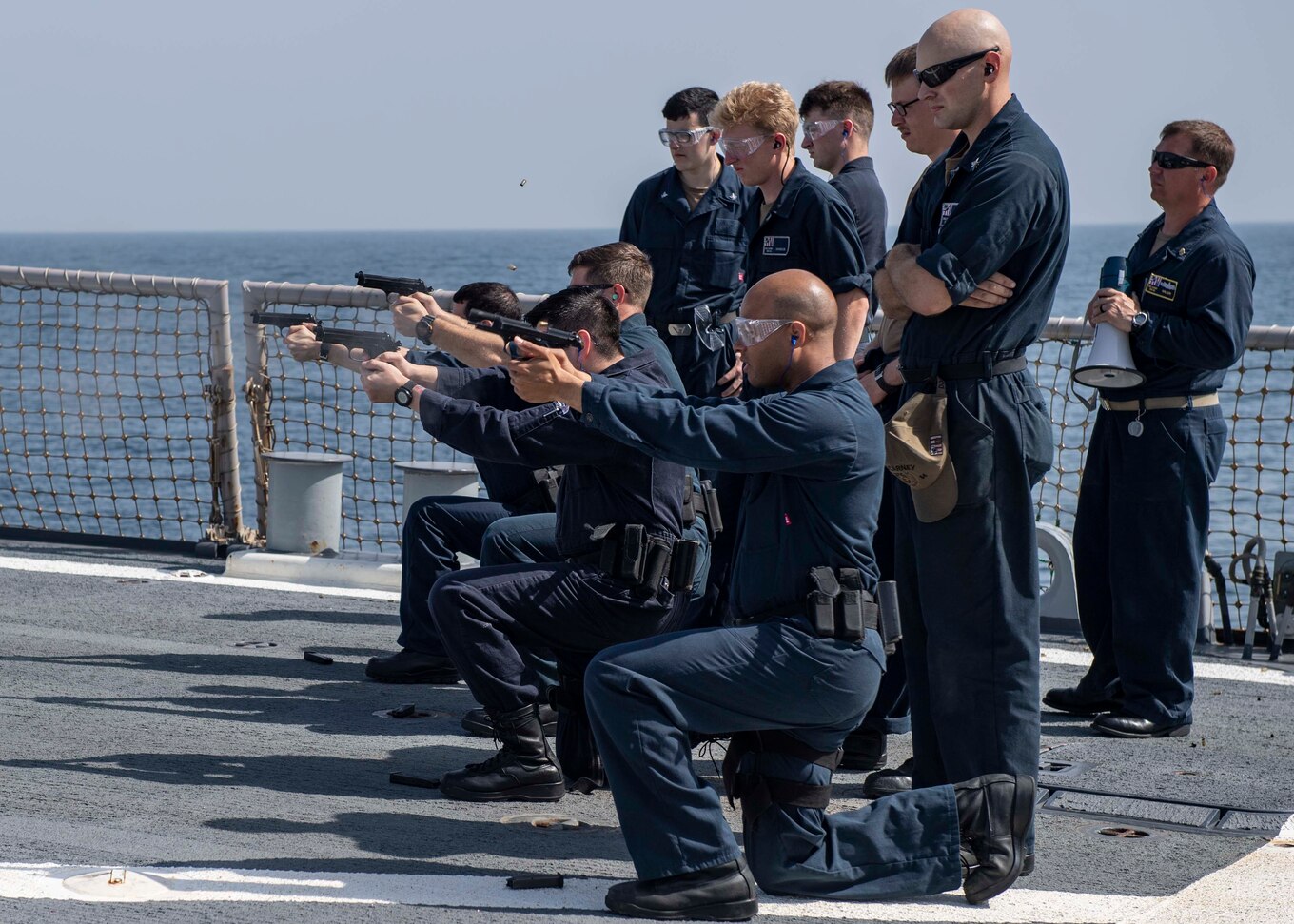 200229-N-TI693-1155 GULF OF OMAN (Feb. 29, 2020) Sailors assigned to the guided-missile destroyer USS Carney (DDG 64) fire M9 pistols down range during a small arms weapons qualification, Feb. 29, 2020. Carney is deployed to the U.S. 5th Fleet area of operations in support of naval operations to ensure maritime stability and security in the Central Region, connecting the Mediterranean Sea and Pacific Ocean through the western Indian Ocean and three strategic choke points. (U.S. Navy photo by Mass Communication Specialist 1st Class Fred Gray IV/Released)