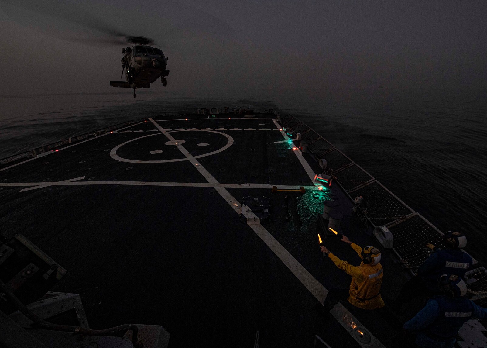 200301-N-TI693-1072 GULF OF OMAN (March 1, 2020) Sailors assigned to the guided-missile destroyer USS Carney (DDG 64) conduct flight operations on the flight deck, March 1, 2020. Carney is deployed to the U.S. 5th Fleet area of operations in support of naval operations to ensure maritime stability and security in the Central Region, connecting the Mediterranean Sea and Pacific Ocean through the western Indian Ocean and three strategic choke points. (U.S. Navy photo by Mass Communication Specialist 1st Class Fred Gray IV/Released)