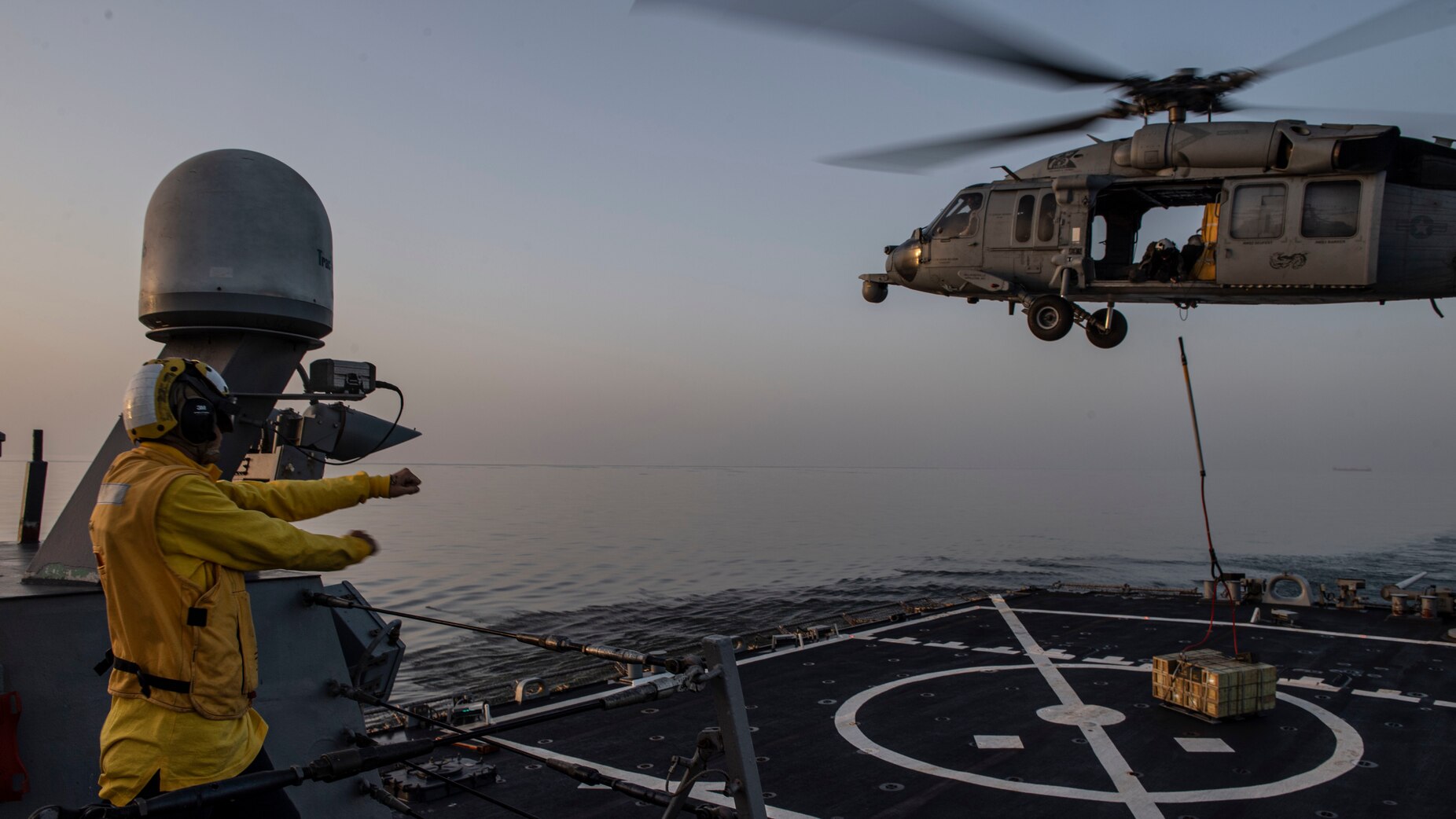 200301-N-TI693-1251 GULF OF OMAN (March 1, 2020) Boatswain’s Mate 2nd Class Chance Vaughan signals for an MH-60S Sea Hawk helicopter to release cargo onto the flight deck aboard the guided-missile destroyer USS Carney (DDG 64), March 1, 2020. Carney is deployed to the U.S. 5th Fleet area of operations in support of naval operations to ensure maritime stability and security in the Central Region, connecting the Mediterranean Sea and Pacific Ocean through the western Indian Ocean and three strategic choke points. (U.S. Navy photo by Mass Communication Specialist 1st Class Fred Gray IV/Released)
