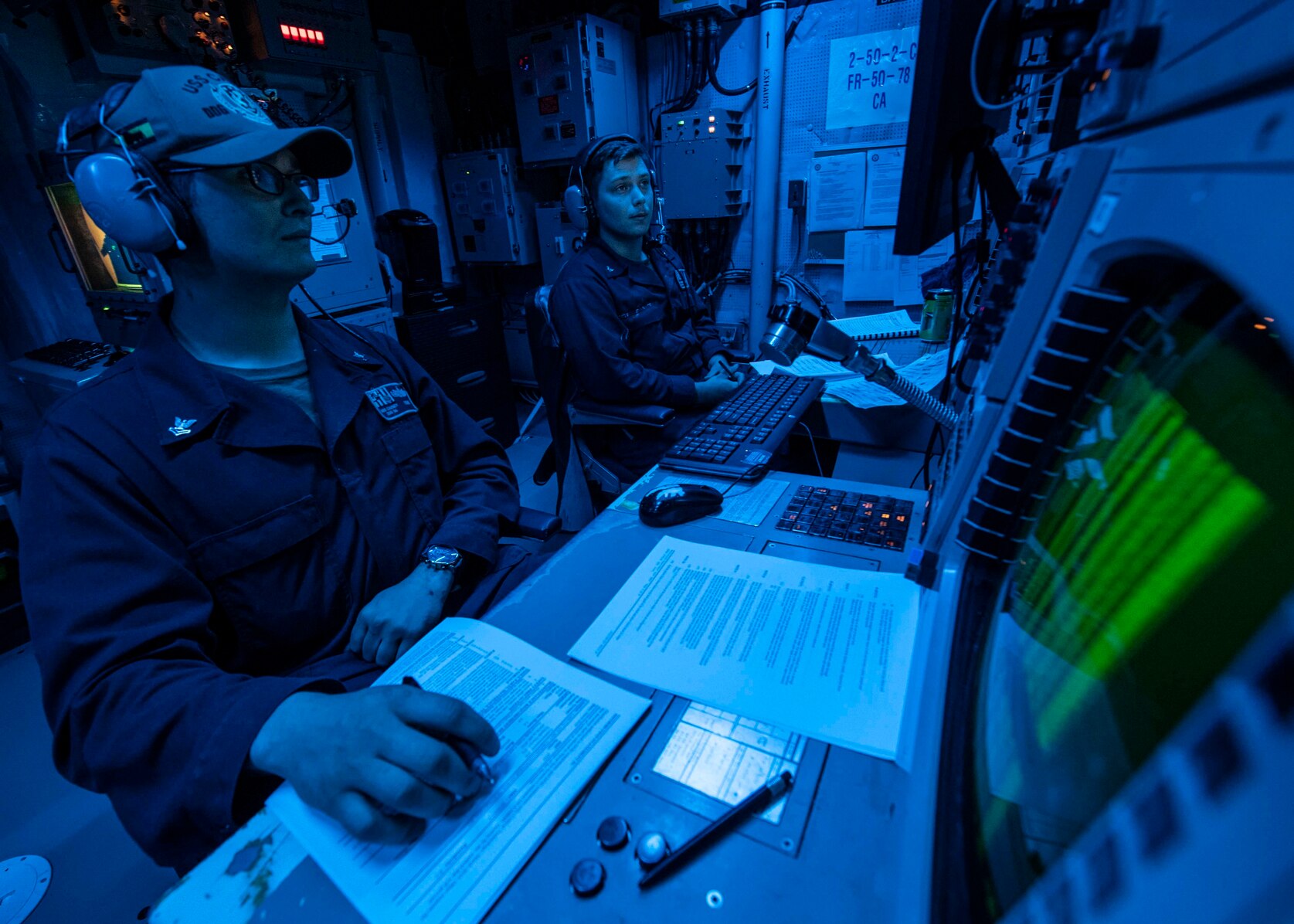 200302-N-TI693-2092 ARABIAN SEA (March 2, 2020) Sonar Technician (Surface) 2nd Class Carson Roney, front, and Sonar Technician (Surface) 3rd Class Steven Franklin stand watch in sonar control monitoring the SLQ-25C NIXIE anti-torpedo countermeasure system aboard the guided-missile destroyer USS Carney (DDG 64), March 2, 2020. Carney is deployed to the U.S. 5th Fleet area of operations in support of naval operations to ensure maritime stability and security in the Central Region, connecting the Mediterranean Sea and Pacific Ocean through the Western Indian Ocean and three strategic choke points. (U.S. Navy photo by Mass Communication Specialist 1st Class Fred Gray IV/Released)