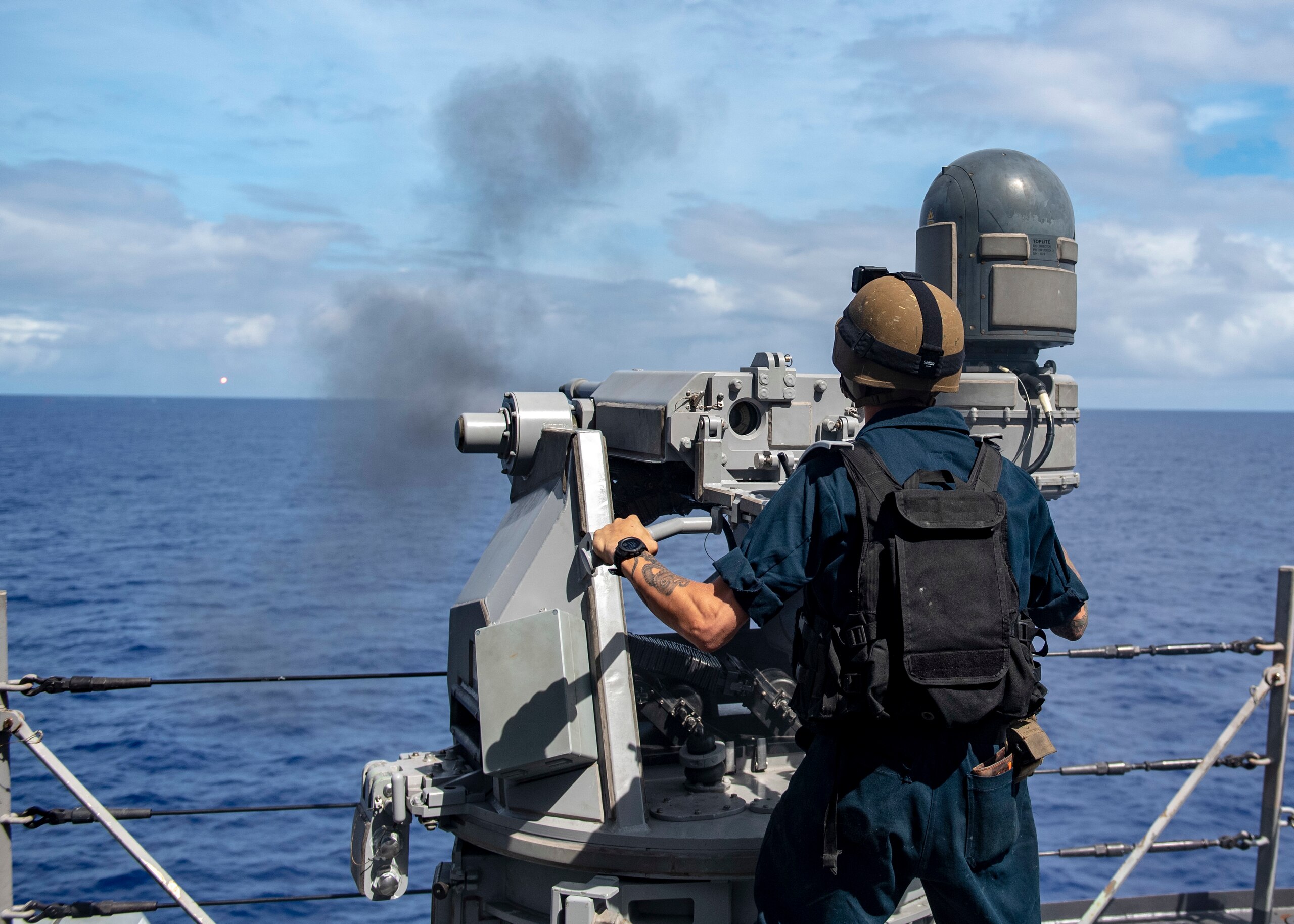 200317-N-AJ005-1325 PHILIPPINE SEA (March 17, 2020) Gunner’s Mate 2nd Class Dustin Tipton fires a Mark 38 25 mm machine gun from the Arleigh Burke-class guided-missile destroyer USS Mustin (DDG 89) during a live-fire exercise. Mustin is underway conducting operations in support of security and stability in the Indo-Pacific while assigned to Destroyer Squadron (DESRON) 15, the Navy’s largest forward-deployed DESRON and the U.S. 7th Fleet’s principal surface force. (U.S. Navy photo by Mass Communication Specialist 3rd Class Cody Beam/Released)