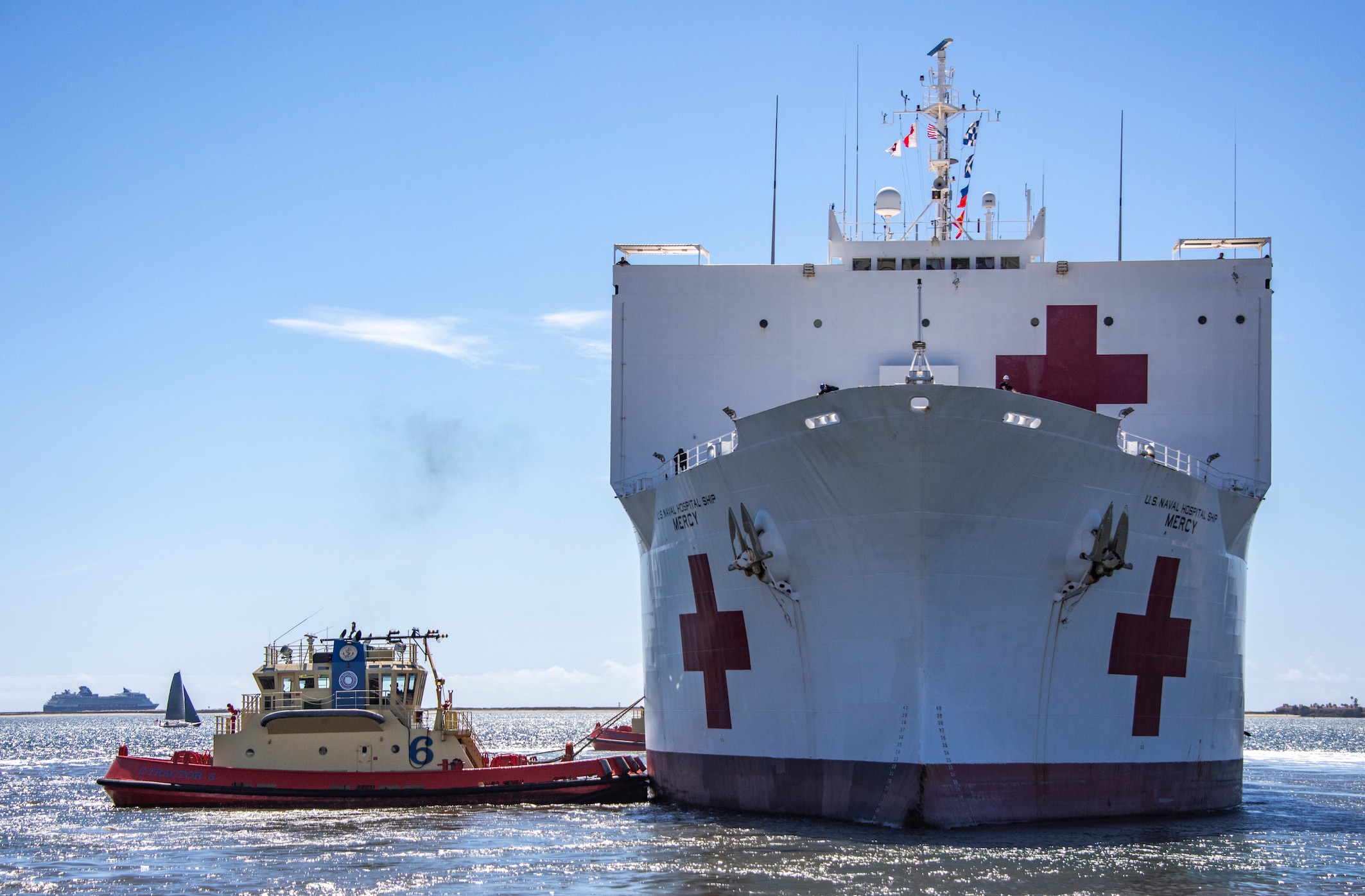 200323-N-ZZ513-2025 SAN DIEGO (March 23, 2020) The Military Sealift Command hospital ship USNS Mercy (T-AH 19) departs San Diego, March 23, 2020. Mercy deployed in support of the nation’s COVID-19 response efforts, and will serve as a referral hospital for non-COVID-19 patients currently admitted to shore-based hospitals. This allows shore base hospitals to focus their efforts on COVID-19 cases. One of the Department of Defense’s missions is Defense Support of Civil Authorities. DoD is supporting the Federal Emergency Management Agency, the lead federal agency, as well as state, local and public health authorities in helping protect the health and safety of the American people. (U.S. Navy video by Mass Communication Specialist 2nd Class Natalie M. Byers/Released)