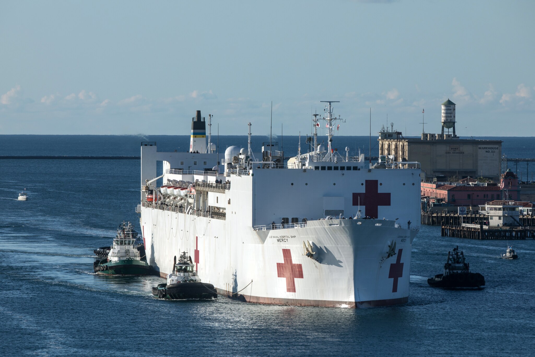 200327-M-VO343-1085 LOS ANGELES (March 27, 2020) The Military Sealift Command hospital ship USNS Mercy (T-AH 19) arrives in Los Angeles, Calif., March 27, 2020. Mercy deployed in support of the nation’s COVID-19 response efforts, and will serve as a referral hospital for non-COVID-19 patients currently admitted to shore-based hospitals. This allows shore base hospitals to focus their efforts on COVID-19 cases. One of the Department of Defense’s missions is Defense Support of Civil Authorities. DOD is supporting the Federal Emergency Management Agency, the lead federal agency, as well as state, local and public health authorities in helping protect the health and safety of the American people. (U.S. Marine Corps photo by Cpl. Alexa M. Hernandez/Released)