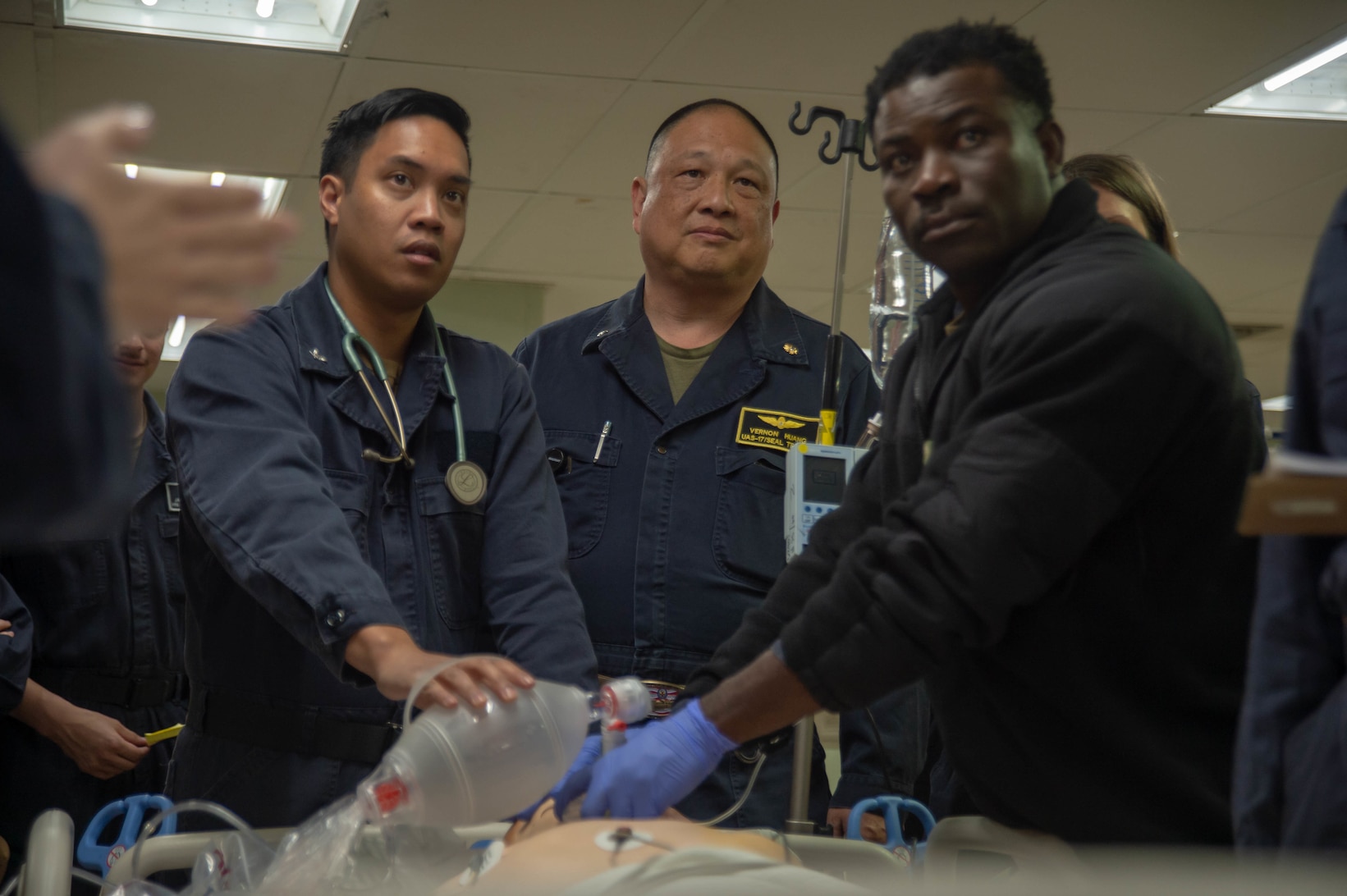 200328-N-LW757-1015 LOS ANGELES (March 28, 2020) Sailors assigned to the hospital ship USNS Mercy (T-AH 19) perform a drill simulating a patient suffering from cardiac arrest in one of the ships intensive care units, March 28, 2020. Mercy deployed in support of the nation's COVID-19 response efforts, and will serve as a referral hospital for non-COVID-19 patients currently admitted to shore-based hospitals. This allows shore base hospitals to focus their efforts on COVID-19 cases. One of the Department of Defense's missions is Defense Support of Civil Authorities. DoD is supporting the Federal Emergency Management Agency, the lead federal agency, as well as state, local and public health authorities in helping protect the health and safety of the American people. (U.S. Navy photo by Mass Communication Specialist Seaman Luke Cunningham/Released)