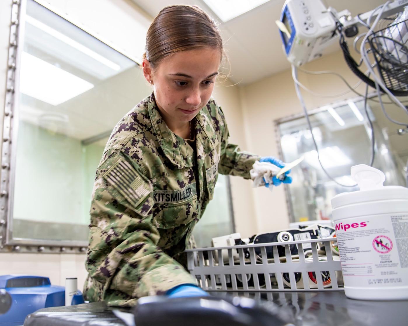 200328-N-PH222-1058 LOS ANGELES (March 28, 2020) Hospitalman Aliah Kitsmiller, from Erie, Colo., sanitizes gurneys aboard the hospital ship USNS Mercy (T-AH 19), March 28, 2020. Mercy deployed in support of the nation's COVID-19 response efforts, and will serve as a referral hospital for non-COVID-19 patients currently admitted to shore-based hospitals. This allows shore base hospitals to focus their efforts on COVID-19 cases. One of the Department of Defense's missions is Defense Support of Civil Authorities. DoD is supporting the Federal Emergency Management Agency, the lead federal agency, as well as state, local and public health authorities in helping protect the health and safety of the American people. (U.S. Navy photo by Mass Communication Specialist 2nd Class Ryan M. Breeden/Released)