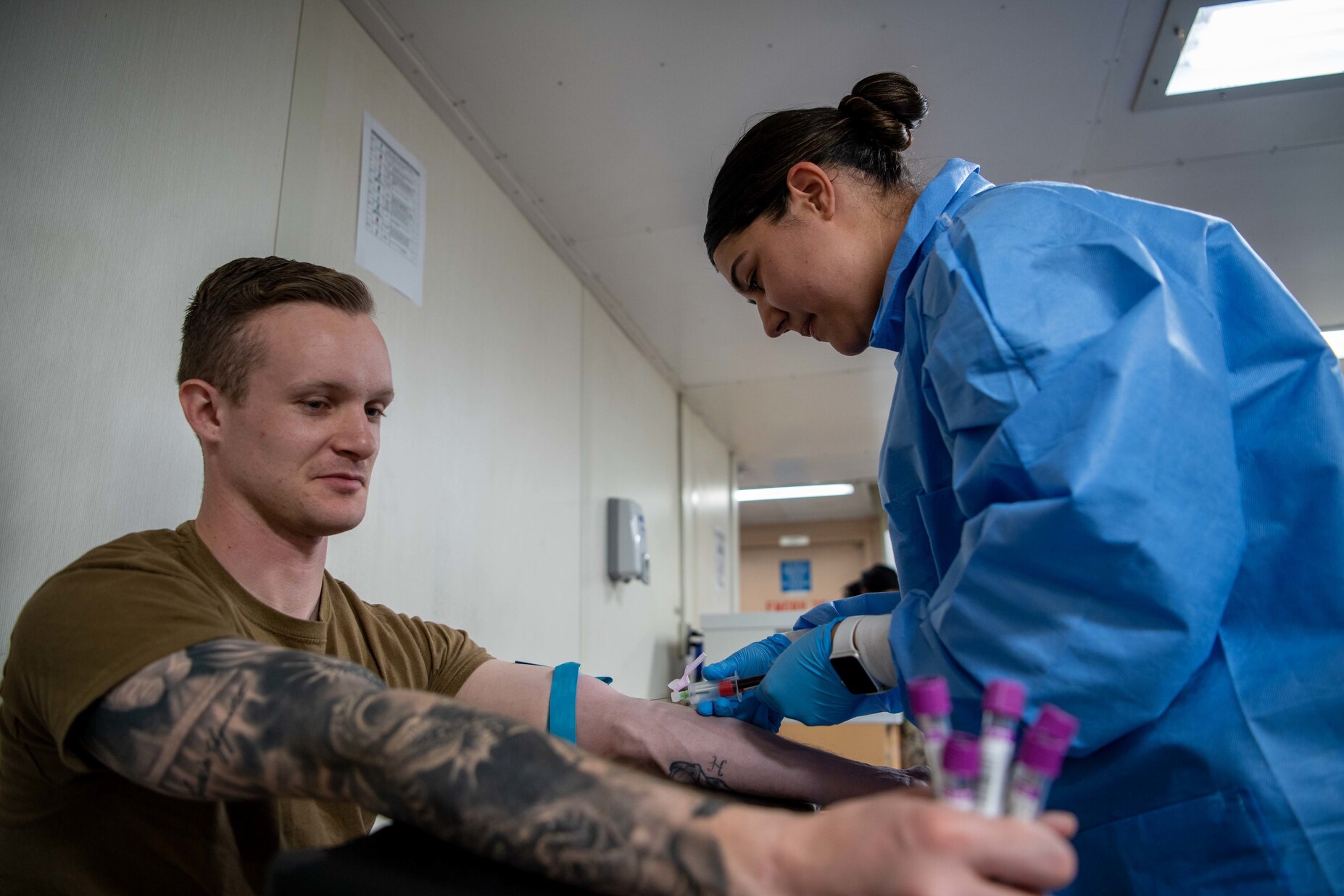 200330-N-FK318-1017 LOS ANGELES (March 30, 2020) Hospital Corpsman 3rd Class Deja Blandino, from Miami,Fla., draws blood from Hospital Corpsman 2nd Class Mikael Peters, from Laport, Ind., during a walking blood bank evolution aboard the hospital ship USNS Mercy (T-AH 19), March 30, 2020. Walking blood banks provide a donor pool database of different blood types in case whole blood is needed for patients. Mercy deployed in support of the nation's COVID-19 response efforts, and will serve as a referral hospital for non-COVID-19 patients currently admitted to shore-based hospitals. This allows shore base hospitals to focus their efforts on COVID-19 cases. One of the Department of Defense's missions is Defense Support of Civil Authorities. DoD is supporting the Federal Emergency Management Agency, the lead federal agency, as well as state, local and public health authorities in helping protect the health and safety of the American people. (U.S. Navy photo by Mass Communication Specialist 2nd Class Abigayle Lutz)