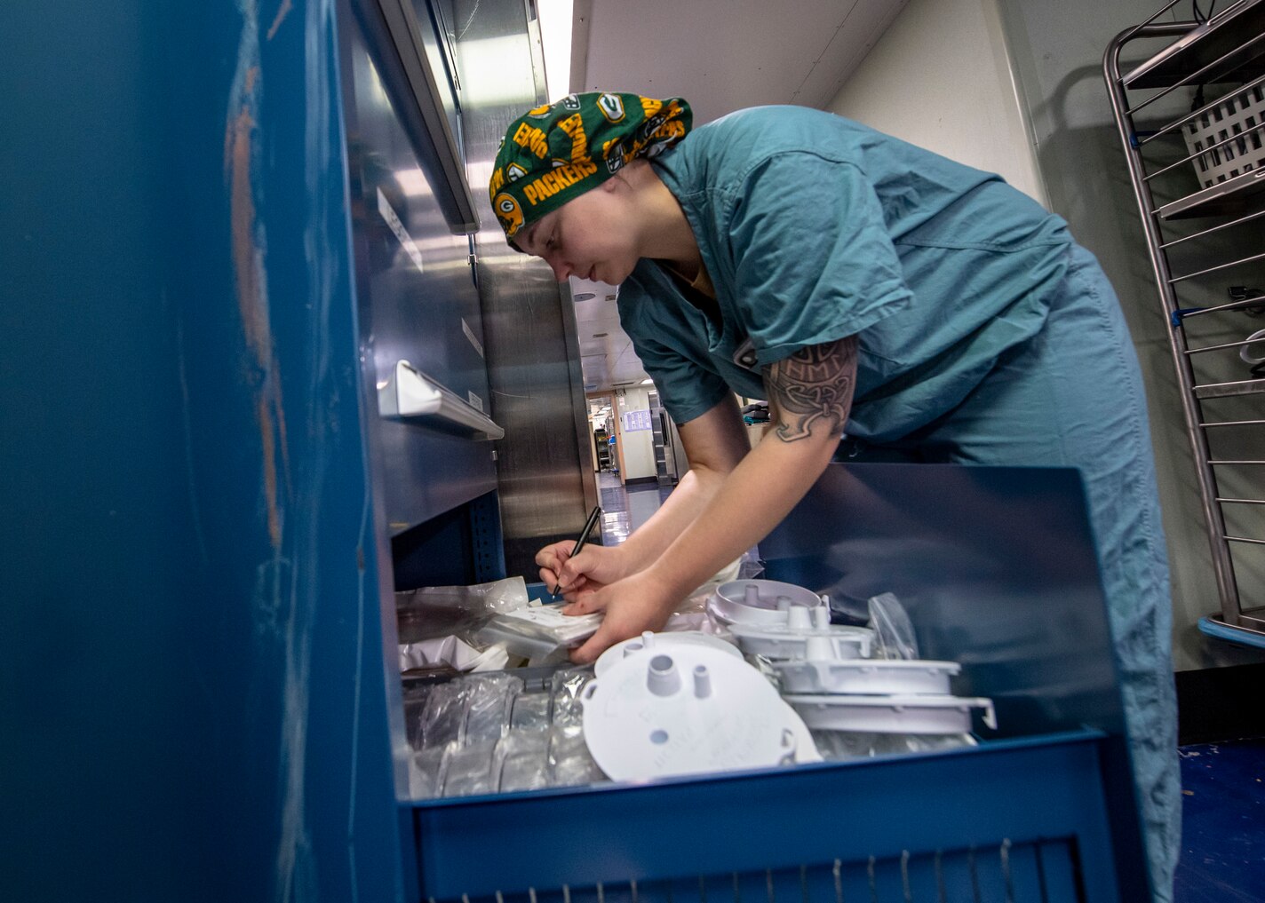200330-N-PH222-1127 LOS ANGELES (March 30, 2020) Hospitalman Skylar Pochinski, from Richfield, Wis., takes inventory of the medical supplies aboard the hospital ship USNS Mercy (T-AH 19), March 30, 2020. Mercy deployed in support of the nation's COVID-19 response efforts, and will serve as a referral hospital for non-COVID-19 patients currently admitted to shore-based hospitals. This allows shore base hospitals to focus their efforts on COVID-19 cases. One of the Department of Defense's missions is Defense Support of Civil Authorities. DoD is supporting the Federal Emergency Management Agency, the lead federal agency, as well as state, local and public health authorities in helping protect the health and safety of the American people. (U.S. Navy photo by Mass Communication Specialist 2nd Class Ryan M. Breeden/Released)