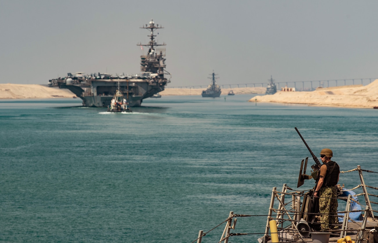 200402-N-MD802-2072 SUEZ CANAL (April 2, 2020) The Harry S. Truman Carrier Strike Group transits the Suez Canal. The Harry S. Truman Carrier Strike Group is deployed to the U.S. 5th Fleet area of operations in support of naval operations to ensure maritime stability and security in the Central Region, connecting the Mediterranean and Pacific through the western Indian Ocean and three strategic choke points. (U.S. Navy photo by Mass Communication Specialist 3rd Class Jack D. Aistrup/Released)