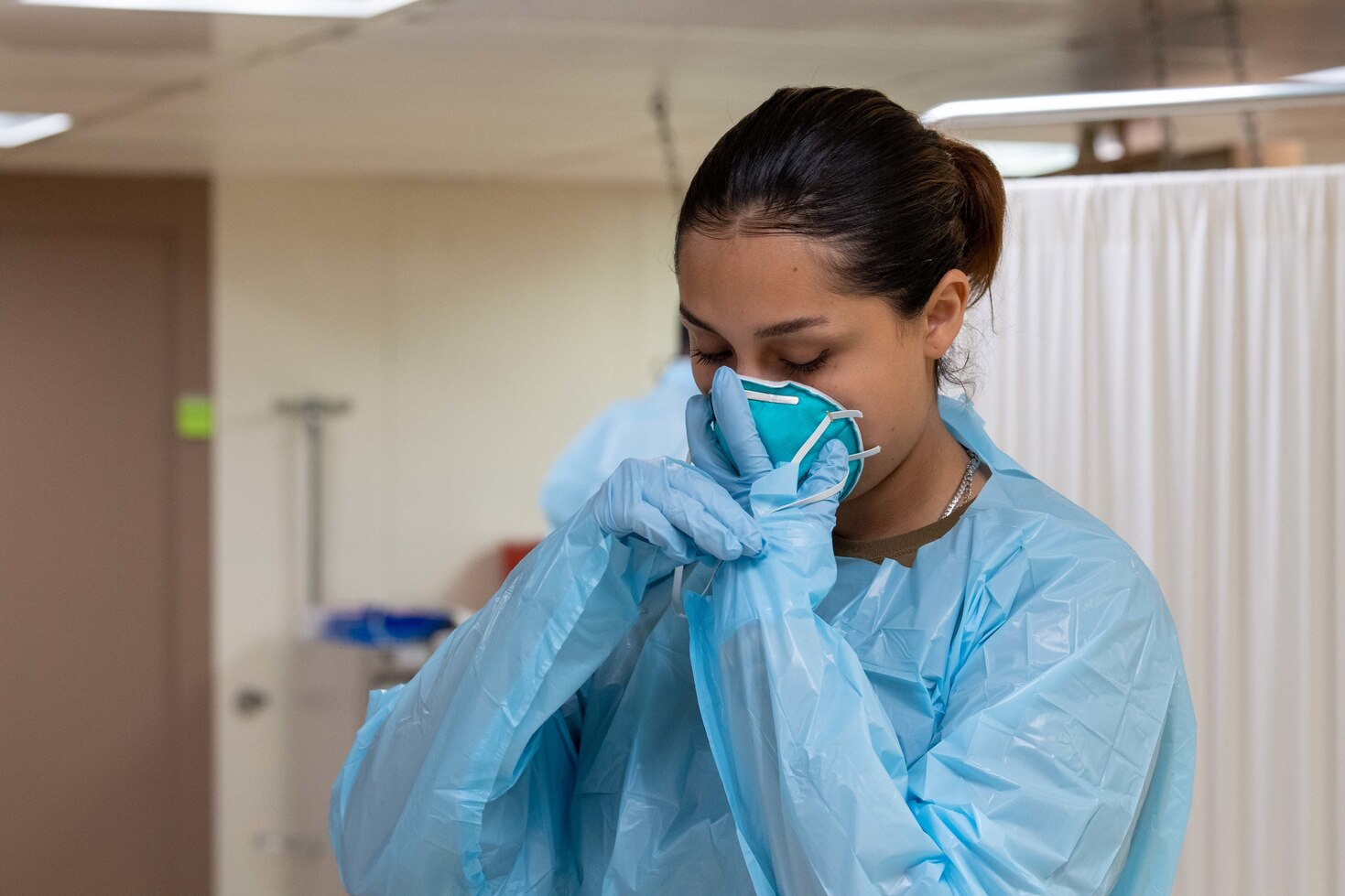 200405-N-FK318-1001 LOS ANGELES (April 5, 2020) Hospitalman Pearl Alvarado, from San Antonio, dons a face mask aboard the hospital ship USNS Mercy (T-AH 19) before working with a patient. Mercy deployed in support of the nation's COVID-19 response efforts, and will serve as a referral hospital for non-COVID-19 patients currently admitted to shore-based hospitals. This allows shore base hospitals to focus their efforts on COVID-19 cases. One of the Department of Defense's missions is Defense Support of Civil Authorities. DoD is supporting the Federal Emergency Management Agency, the lead federal agency, as well as state, local and public health authorities in helping protect the health and safety of the American people. (U.S. Navy photo by Mass Communication Specialist 2nd Class Abigayle Lutz/Released)