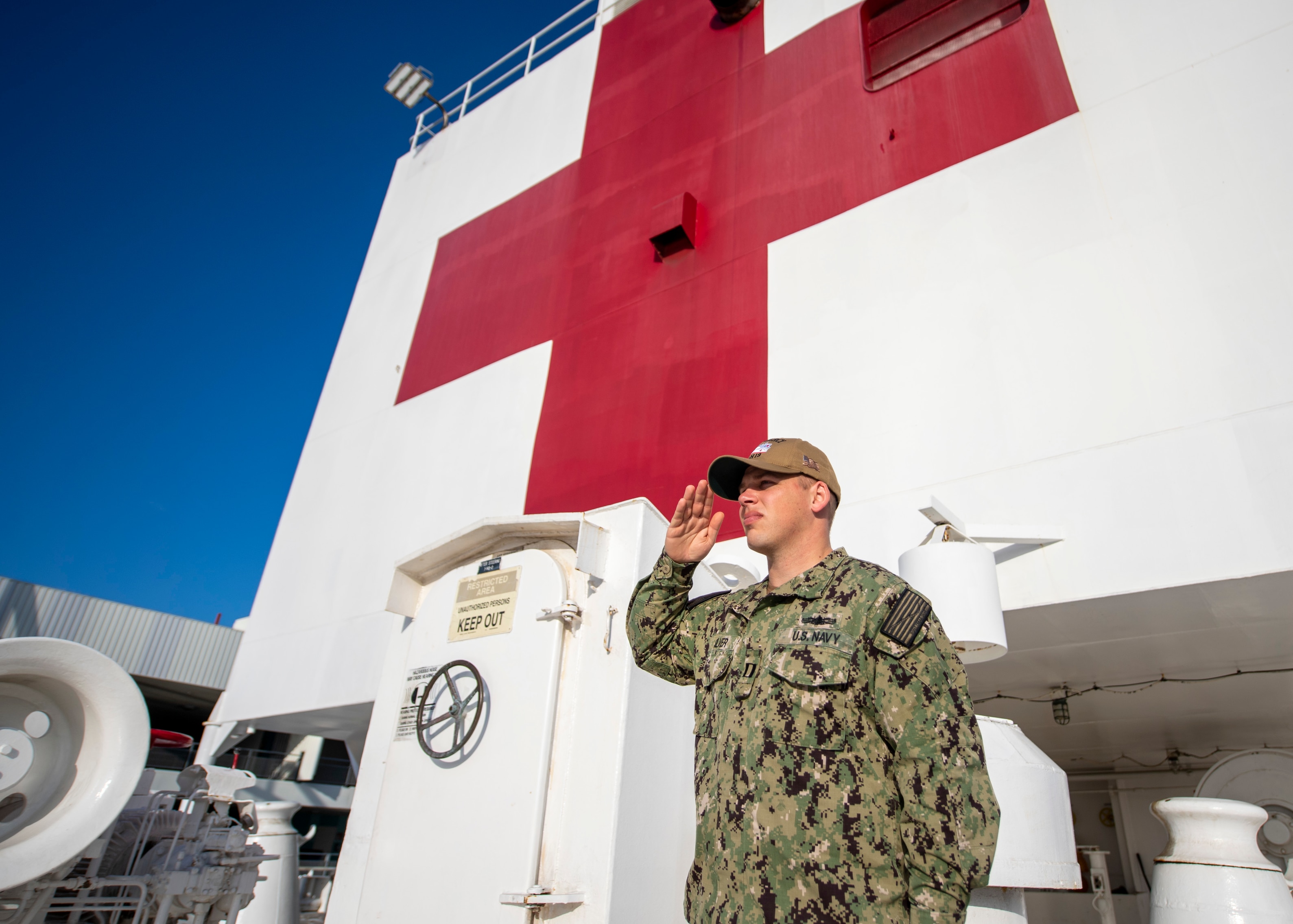 200405-N-PH222-1032 LOS ANGELES (April 5, 2020) Lt. Ronald Silver, from Ontario, Calif., renders a hand salute during morning colors aboard the hospital ship USNS Mercy (T-AH 19). Mercy deployed in support of the nation's COVID-19 response efforts, and will serve as a referral hospital for non-COVID-19 patients currently admitted to shore-based hospitals. This allows shore base hospitals to focus their efforts on COVID-19 cases. One of the Department of Defense's missions is Defense Support of Civil Authorities. DoD is supporting the Federal Emergency Management Agency, the lead federal agency, as well as state, local and public health authorities in helping protect the health and safety of the American people. (U.S. Navy photo by Mass Communication Specialist 2nd Class Ryan M. Breeden/Released)