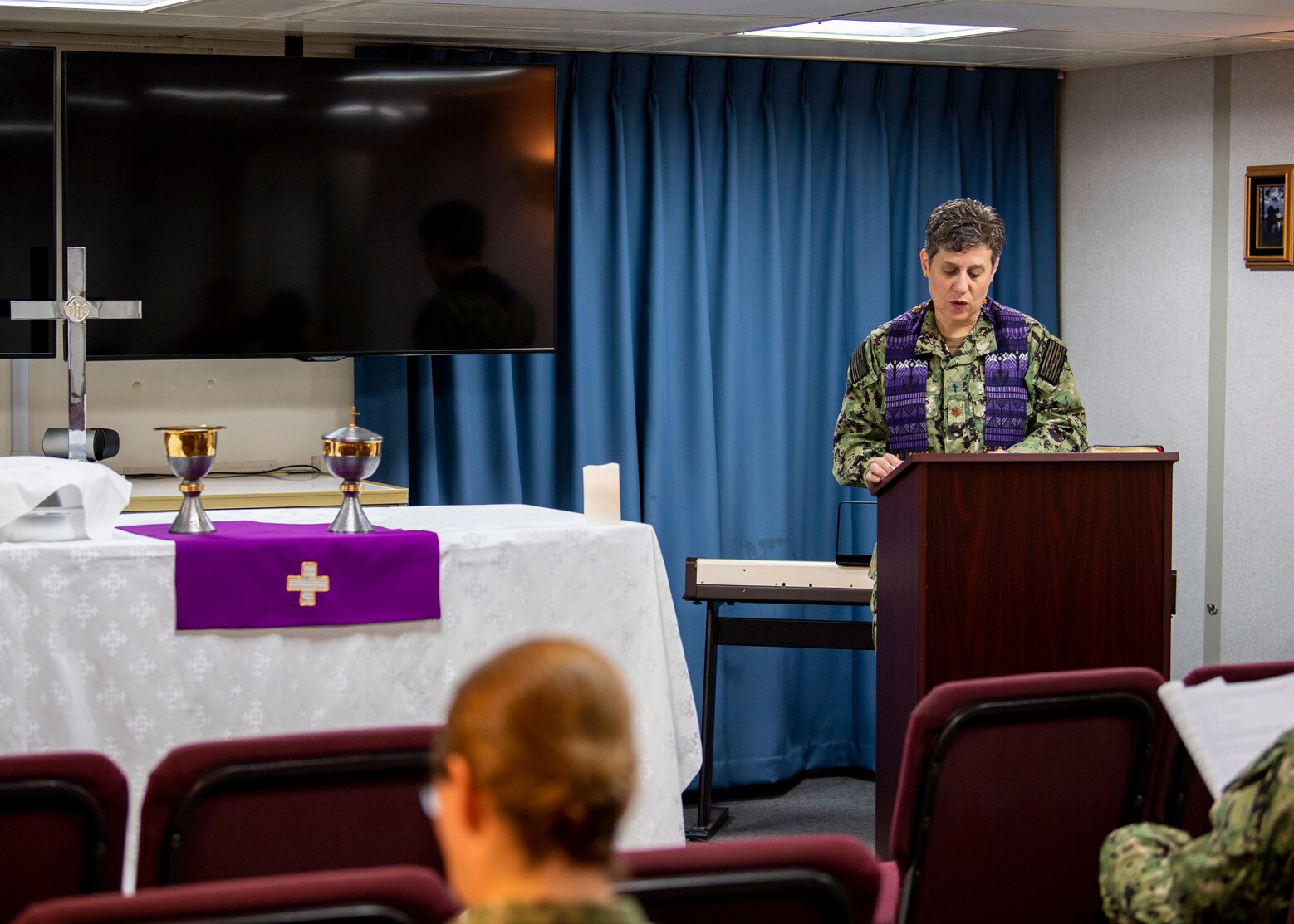 200405-N-PH222-1047 LOS ANGELES (April 5, 2020) Lt. Cmdr. Genevieve Clark, ship�s chaplain, from McMinnville, Ore., conducts traditional protestant Christian services in the chapel aboard the hospital ship USNS Mercy (T-AH 19). Mercy deployed in support of the nation's COVID-19 response efforts, and will serve as a referral hospital for non-COVID-19 patients currently admitted to shore-based hospitals. This allows shore base hospitals to focus their efforts on COVID-19 cases. One of the Department of Defense's missions is Defense Support of Civil Authorities. DoD is supporting the Federal Emergency Management Agency, the lead federal agency, as well as state, local and public health authorities in helping protect the health and safety of the American people. (U.S. Navy photo by Mass Communication Specialist 2nd Class Ryan M. Breeden/Released)