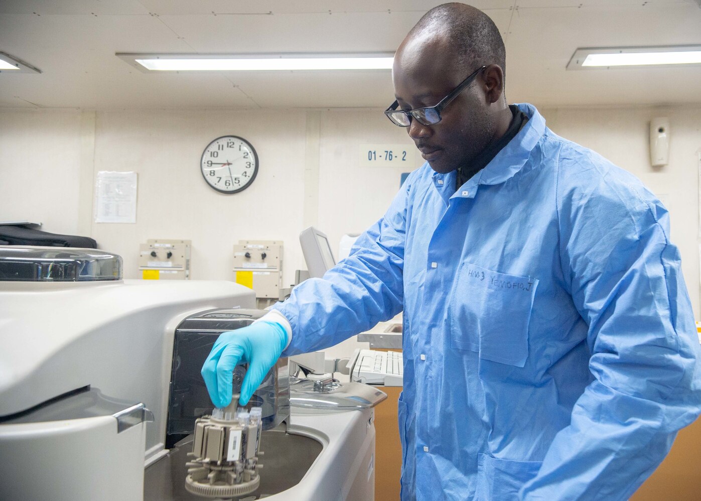 200406-N-DA693-1056 LOS ANGELES (April 6, 2020) Hospital Corpsman 3rd Class Julius Yemofio, from Houston, a laboratory technician assigned to hospital ship USNS Mercy (T-AH 19), inserts samples into a centrifuge in the ship’s laboratory, April 6, 2020. Mercy deployed in support of the nation's COVID-19 response efforts, and will serve as a referral hospital for non-COVID-19 patients currently admitted to shore-based hospitals. This allows shore base hospitals to focus their efforts on COVID-19 cases. One of the Department of Defense's missions is Defense Support of Civil Authorities. DoD is supporting the Federal Emergency Management Agency, the lead federal agency, as well as state, local and public health authorities in helping protect the health and safety of the American people. (U.S. Navy photo by Mass Communication Specialist 3rd Class Jake Greenberg/Released)