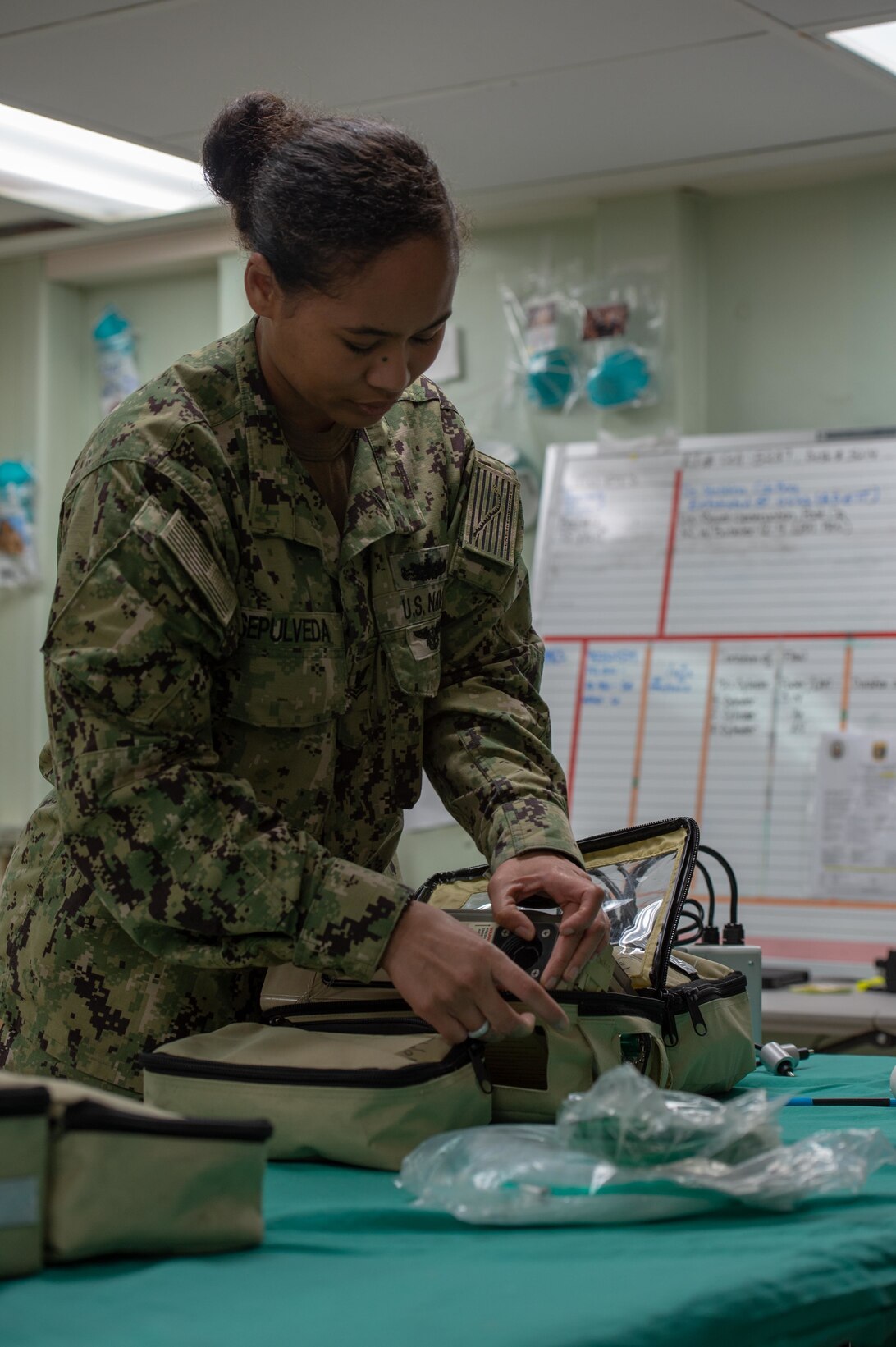200406-N-VI515-1005 LOS ANGELES (April 6, 2020) Hospital Corpsman 2nd Class Angelina Sepulveda, from Petersborough, U.K., assembles a patient transport care kit onboard the hospital ship USNS Mercy (T-AH 19). Mercy deployed in support of the nation's COVID-19 response efforts, and will serve as a referral hospital for non-COVID-19 patients currently admitted to shore-based hospitals. This allows shore base hospitals to focus their efforts on COVID-19 cases. One of the Department of Defense's missions is Defense Support of Civil Authorities. DoD is supporting the Federal Emergency Management Agency, the lead federal agency, as well as state, local and public health authorities in helping protect the health and safety of the American people. (U.S. Navy photo by Mass Communication Specialist 2nd Class Erwin Jacob Miciano/Released)