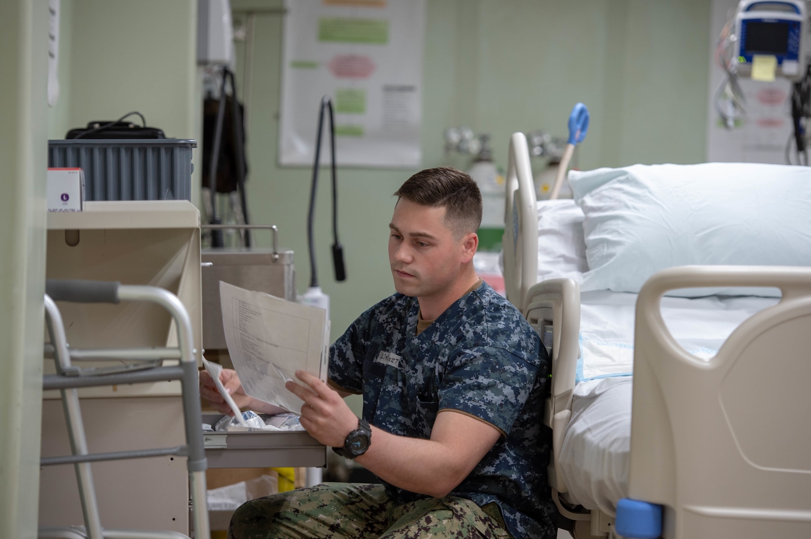 200406-N-VI515-1042 LOS ANGELES (April 6, 2020) Hospitalman Holden Gilbert, from Fort Worth, Texas, inventories medical supplies onboard the hospital ship USNS Mercy (T-AH 19). Mercy deployed in support of the nation's COVID-19 response efforts, and will serve as a referral hospital for non-COVID-19 patients currently admitted to shore-based hospitals. This allows shore base hospitals to focus their efforts on COVID-19 cases. One of the Department of Defense's missions is Defense Support of Civil Authorities. DoD is supporting the Federal Emergency Management Agency, the lead federal agency, as well as state, local and public health authorities in helping protect the health and safety of the American people. (U.S. Navy photo by Mass Communication Specialist 2nd Class Erwin Jacob Miciano/Released)