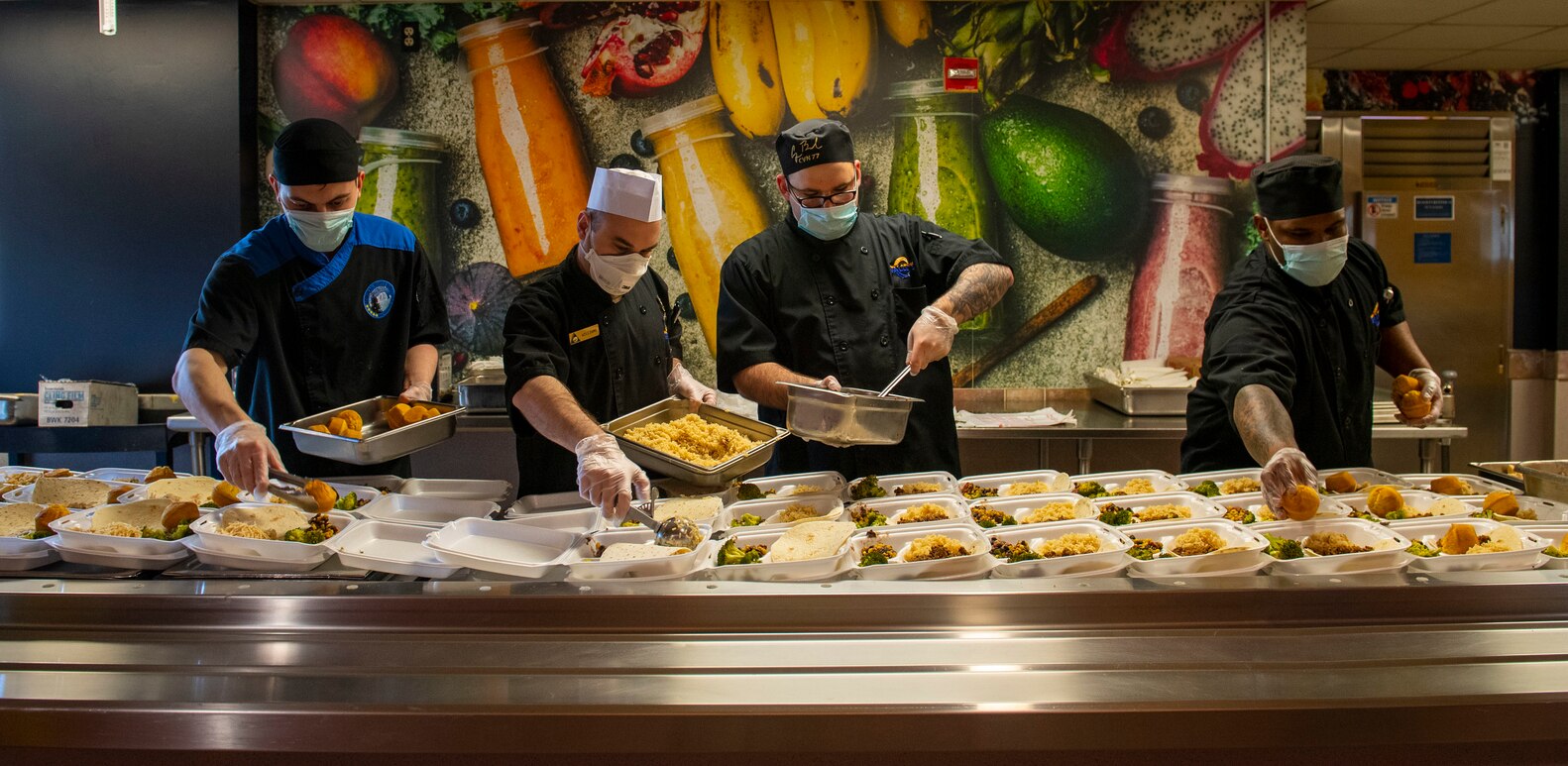 200414-N-HC646-0328 OAK HARBOR, Wash. (April 14, 2019) Sailors working in the Admiral Nimitz Hall Galley prepare pre-packaged meals on Ault Field. The Admiral Nimitz Hall Galley remains open to serve customers while maintaining social distancing and cleanliness guidelines to reduce the risk of the cross contamination of COVID-19 on Ault Field. (U.S. Navy photo by Mass Communication Specialist 2nd Class Marc Cuenca/Released)
