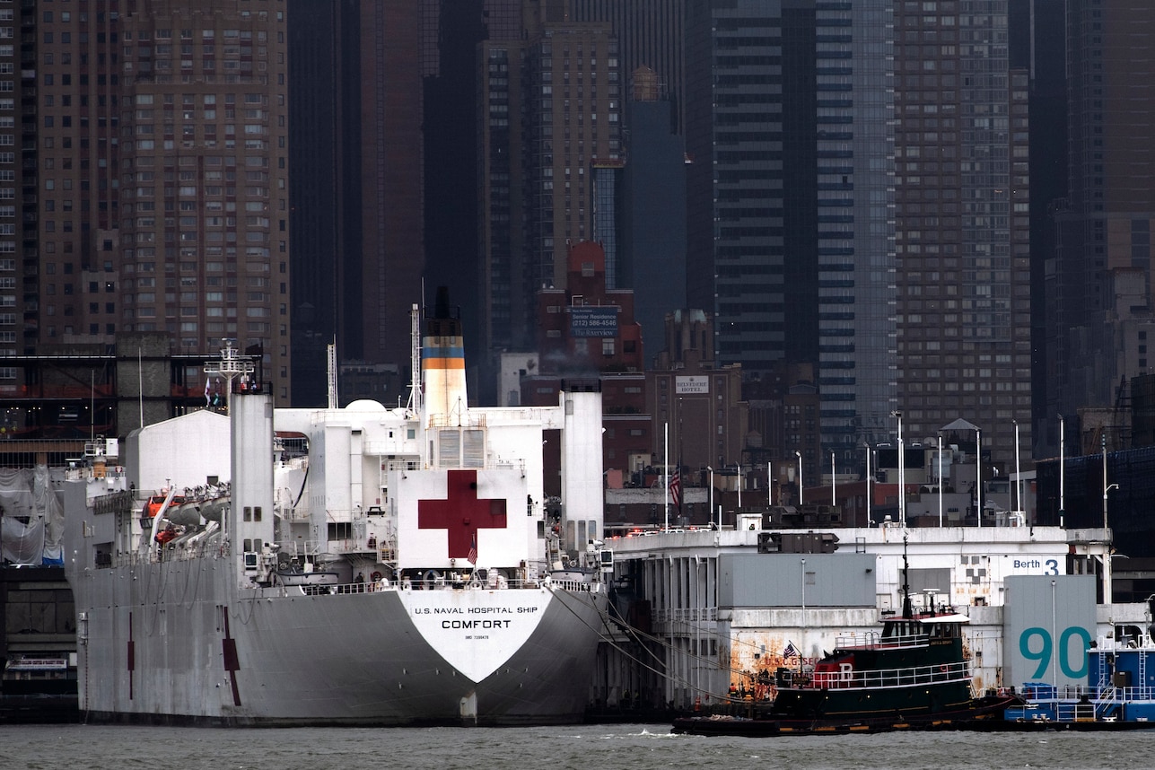 200430-N-HT995-1001 NEW YORK (April 30, 2020) The hospital ship USNS Comfort (T-AH 20) departs New York Harbor after treating patients in New York and New Jersey. The ship and its embarked medical task force remain prepared for future tasking. The Navy, along with other U.S. Northern Command dedicated forces, remains engaged throughout the nation in support of the broader COVID-19 response.(U.S. Navy photo by Mass Communication Specialist 3rd Class Omar N. Rubi/Released)