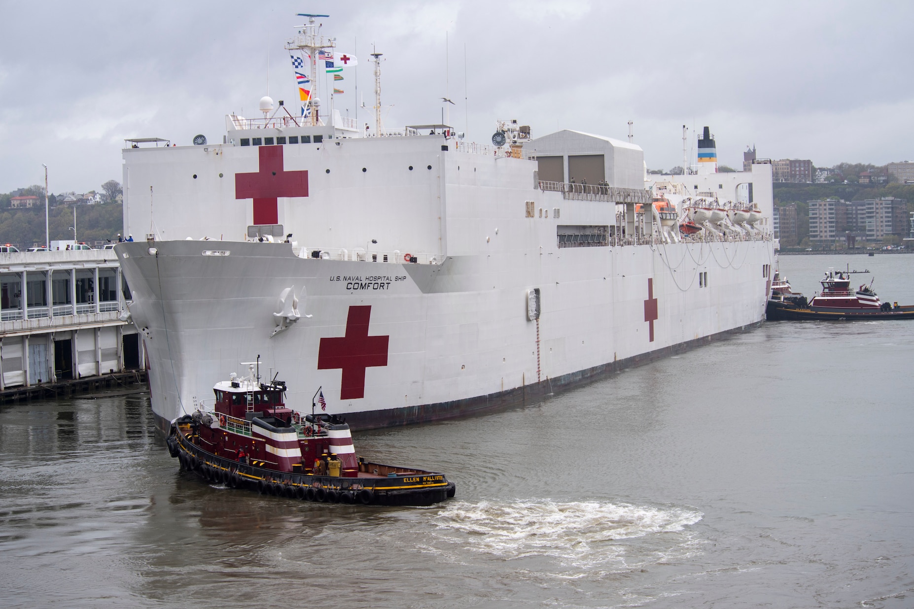 200430-N-OK547-1043 NEW YORK (April 30, 2020) The hospital ship USNS Comfort (T-AH 20) departs New York Harbor after treating patients in New York and New Jersey. The ship and its embarked medical task force remain prepared for future tasking. The Navy, along with other U.S. Northern Command dedicated forces, remains engaged throughout the nation in support of the broader COVID-19 response.(U.S. Navy photo by Mass Communication Specialist 3rd Class Keia Randall/Released)