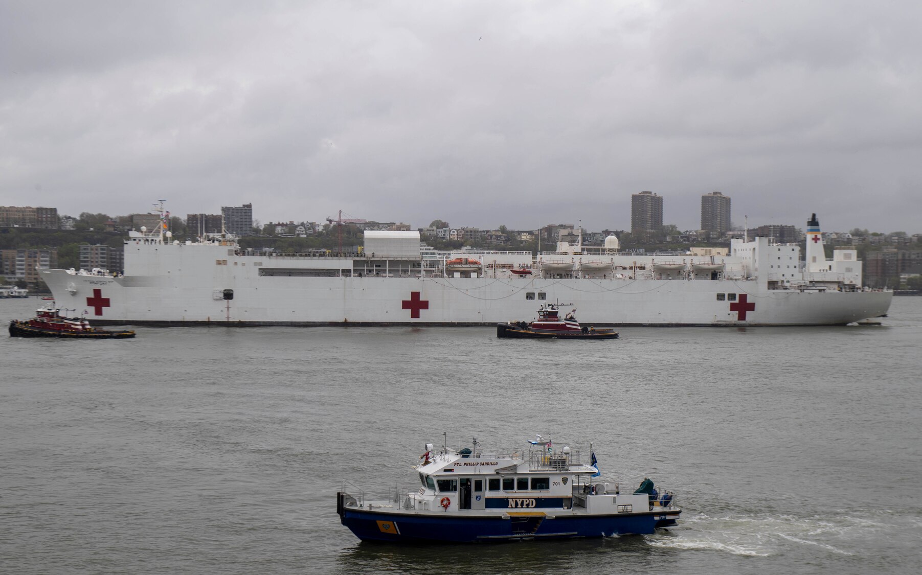 200430-N-OK547-1059 NEW YORK (April 30, 2020) The hospital ship USNS Comfort (T-AH 20) departs New York Harbor after treating patients in New York and New Jersey. The ship and its embarked medical task force remain prepared for future tasking. The Navy, along with other U.S. Northern Command dedicated forces, remains engaged throughout the nation in support of the broader COVID-19 response.(U.S. Navy photo by Mass Communication Specialist 3rd Class Keia Randall/Released)